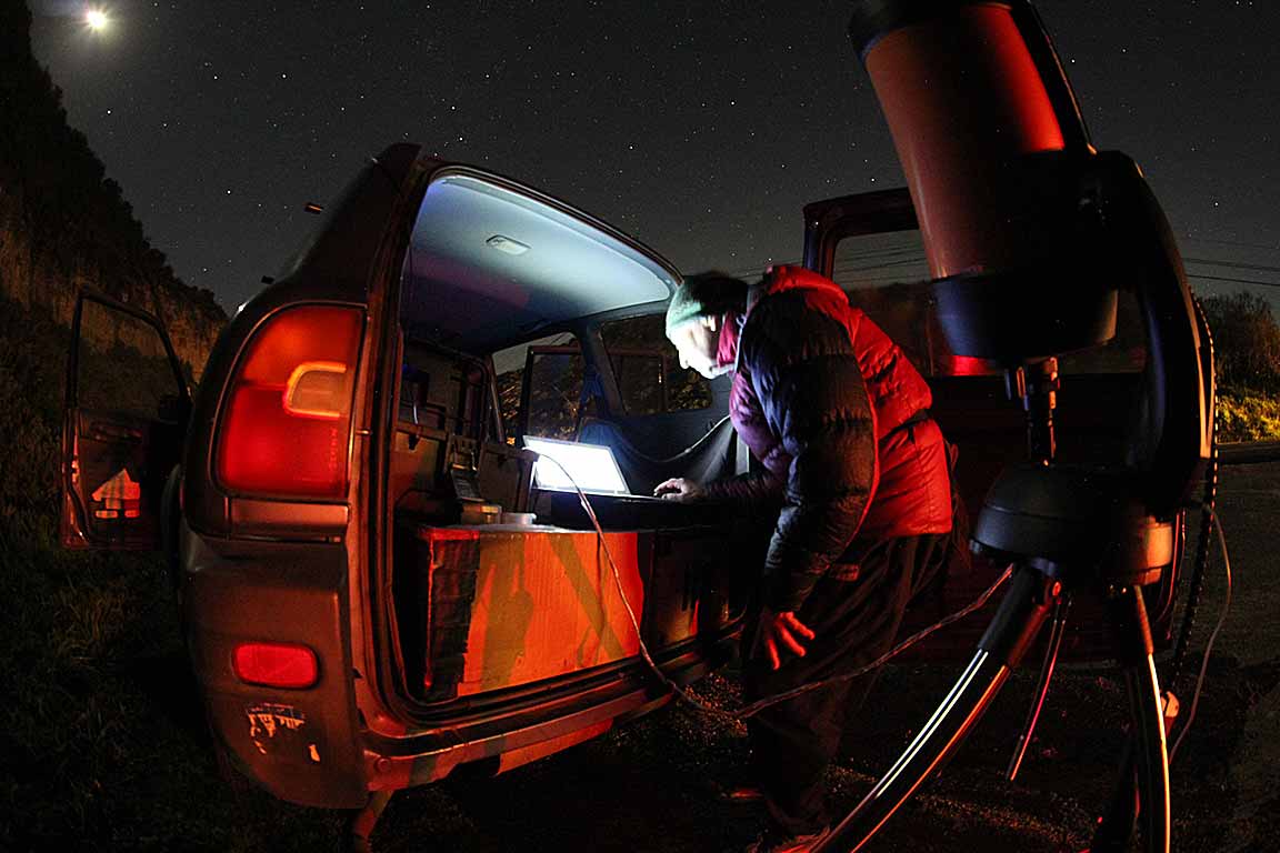 I got a recording at 2x from the BD beach parking lot. Looked like an event, on the order of a sec. The altitude wasn't a problem, the camera fit without the diagonal after the align and goto. That long parking lot was empty, then several cars of youngsters drove up and parked right next to me. They didn't bother me though, they just walked to a party on the beach I guess.I got a clear 1.5349 sec event for Greig, 2x at the Bonny Doon beach parking lot Feb. 22. There were scattered high clouds but it was clear in the target area.