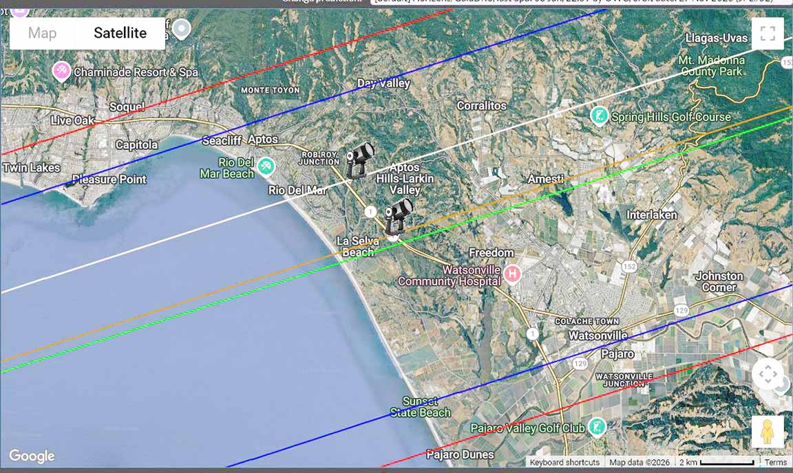 I observed from the cul-de-sac off Mar Monte Rd (La Selva Drive) under good calm conditions. Looked like a miss but not sure. Not reduced yet.