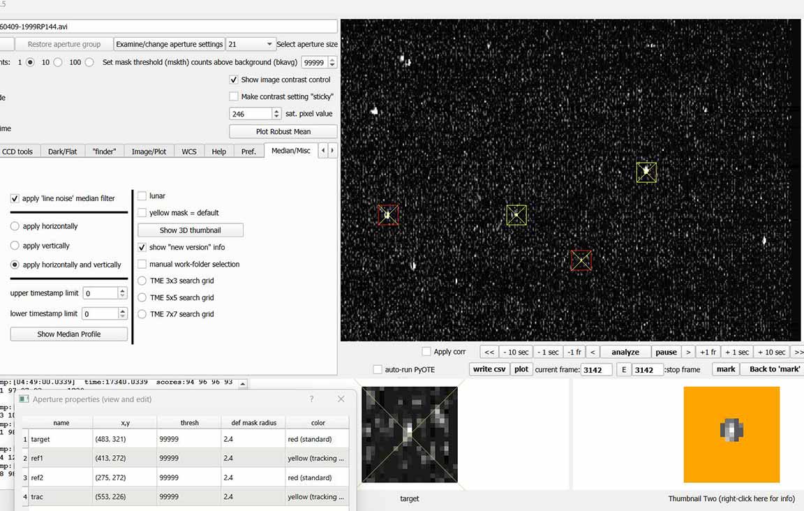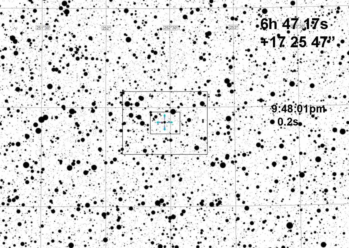 I observed this from home. Skies were clear. I set up at the foot of the driveway, at 2x. Good skies, and I was able to record at 2x, although the target was quite faint it was there pretty reliabily on almost every frame. A 0.2s event would have given 5 consecutive points at zero. In fact, I got only 1. It's a probable miss, but there is a zero point right at the predicted time. But there were many other single point zeros, and PyOTE said my drop was not significant. So, probable miss, but unsure. I'll file it as 'miss' and 'unsure'.