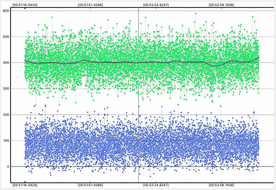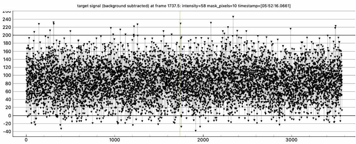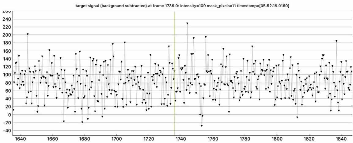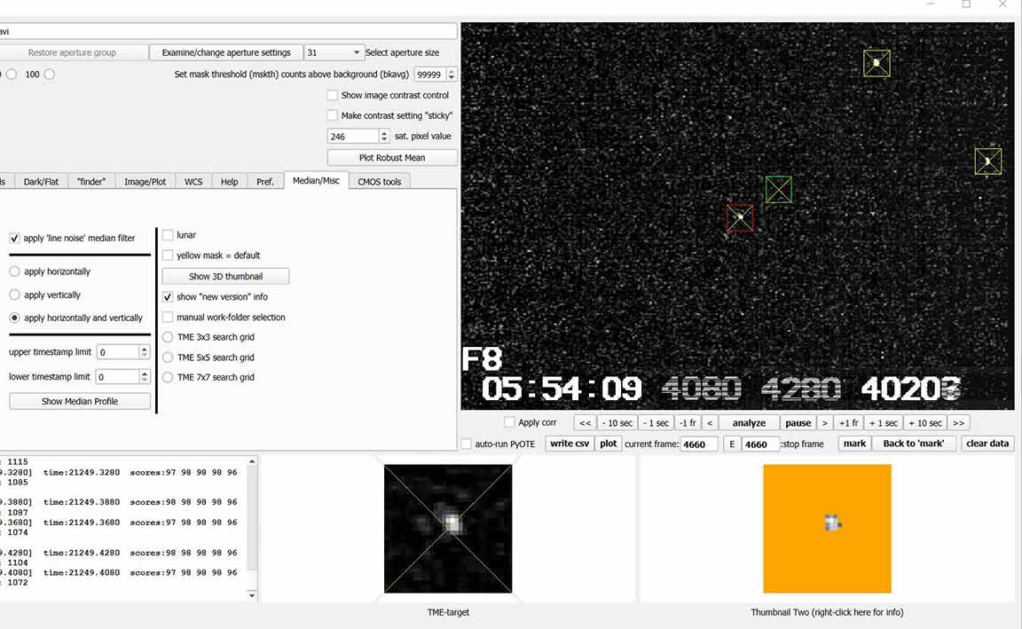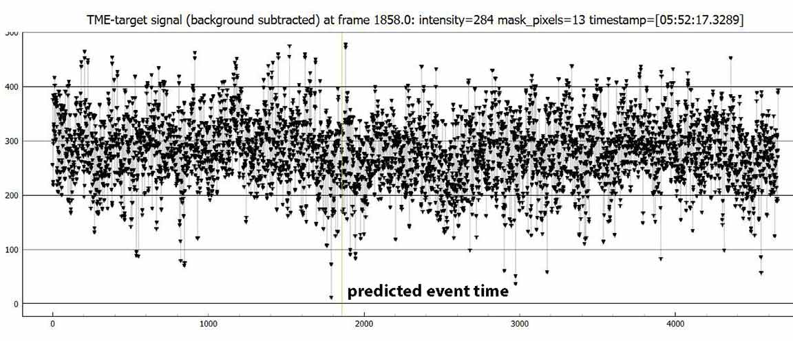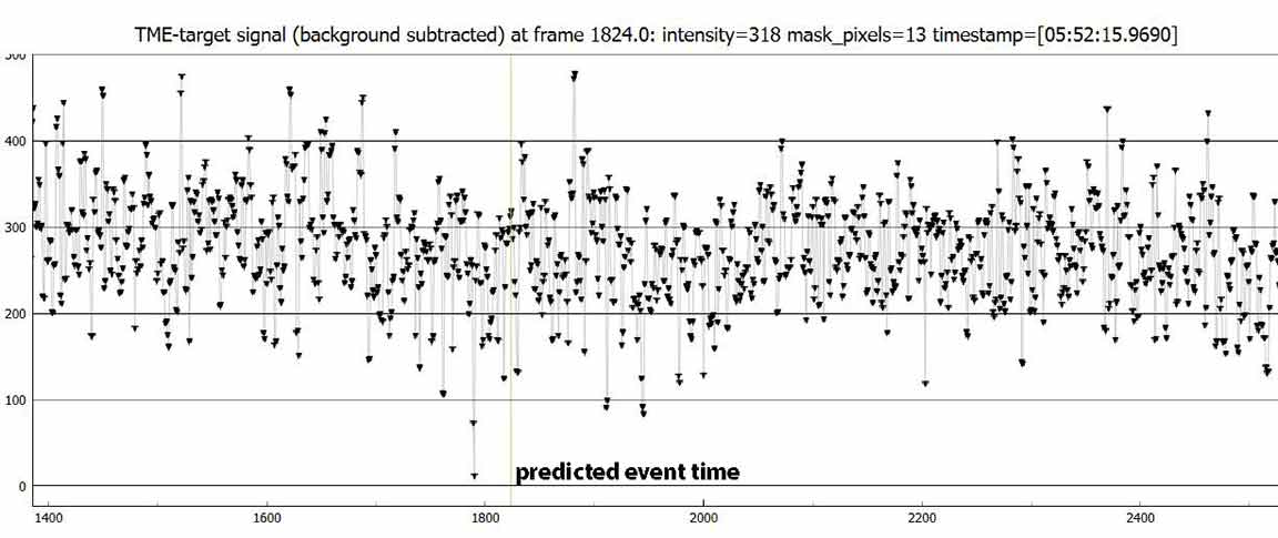 I didn't get a clear event for 1032 T-2, 1x from Laurel road. Zooming in, there is a rough dip near predicted time of 5:52:16, but if I have pyote look for an event, it finds a 0.18 sec event at 5:52:53, 37 sec after predicted. However, the tracking star dips at this time too. I did do smoothing but target still roughly dipped. If I trim to 15 sec before and after predicted, it finds an event at at 5:52:05, 11 sec before predicted, with low 0.5 sigma NIE. If I trim further to 5 sec around predicted time, it finds a dip at 05:52:16.5499, but very short at 0.0834 sec with a low 1.2 sigma NIE test. So looks like just noise and a miss unless I trim very selectively, and unless you have a positive I can corroborate with. I wasn't far from centerline and predicted max was almost a second so prediction could have been off.