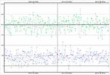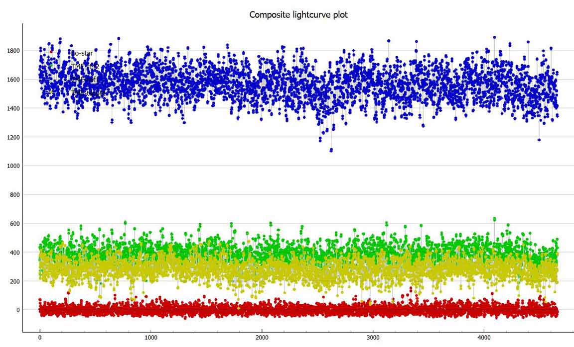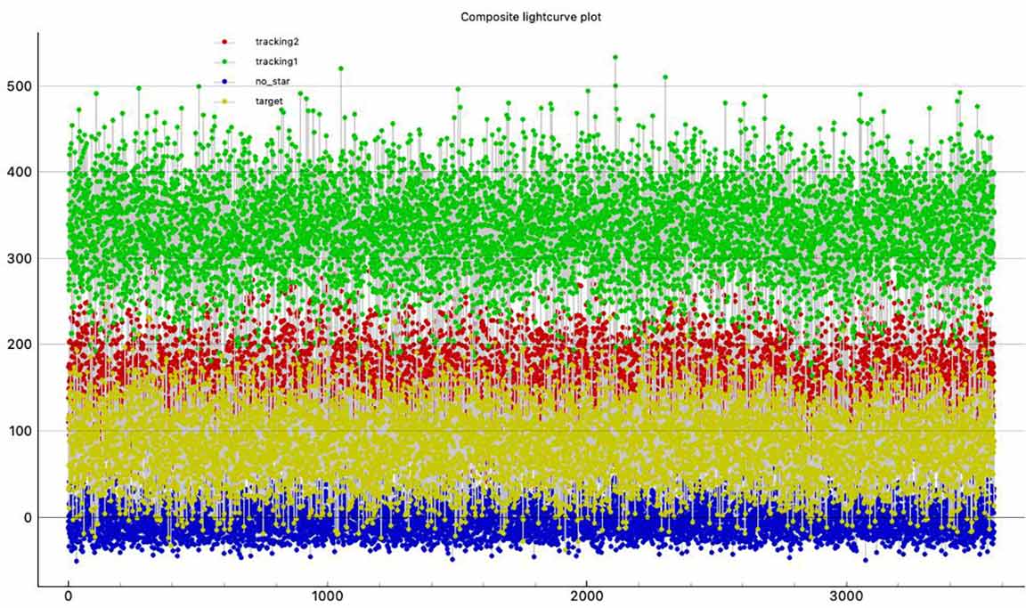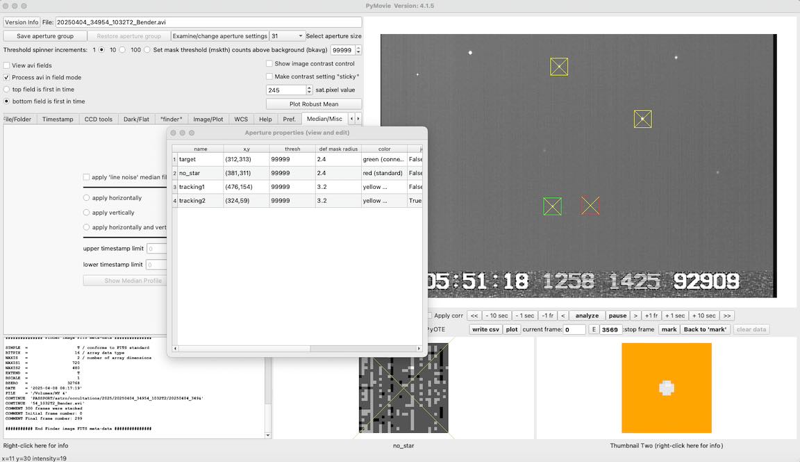 RN: We had wind this night. I had a vehicle to help shield me, and so had not much trouble. Kirk was out in the open, although in an area of trees and steep ground which also helped with wind. I see very short dips scattered in both of our light curves which I suspect were brief vibrations from tracking. The star was bright and the predicted duration was long, and although it's not impossible there could be a brief 1 or 2 integration drop, the odds that a positive would be that short is very low. If real, they should drop to zero. I'm convinced I had a miss, but I was 1/2 asteroid radius north of Kirk and so my miss doesn't raise the odds of a miss for Kirk very much. However, given the breeze, I think it's safest to simply call both of our observations misses and then let the commentary stand on its own. If at some distant time when there's a rock solid orbit for this object and it become highly likely that Kirk must have had a grazing event, then so be it. But that outcome too, is very unlikely.