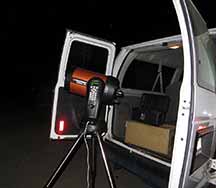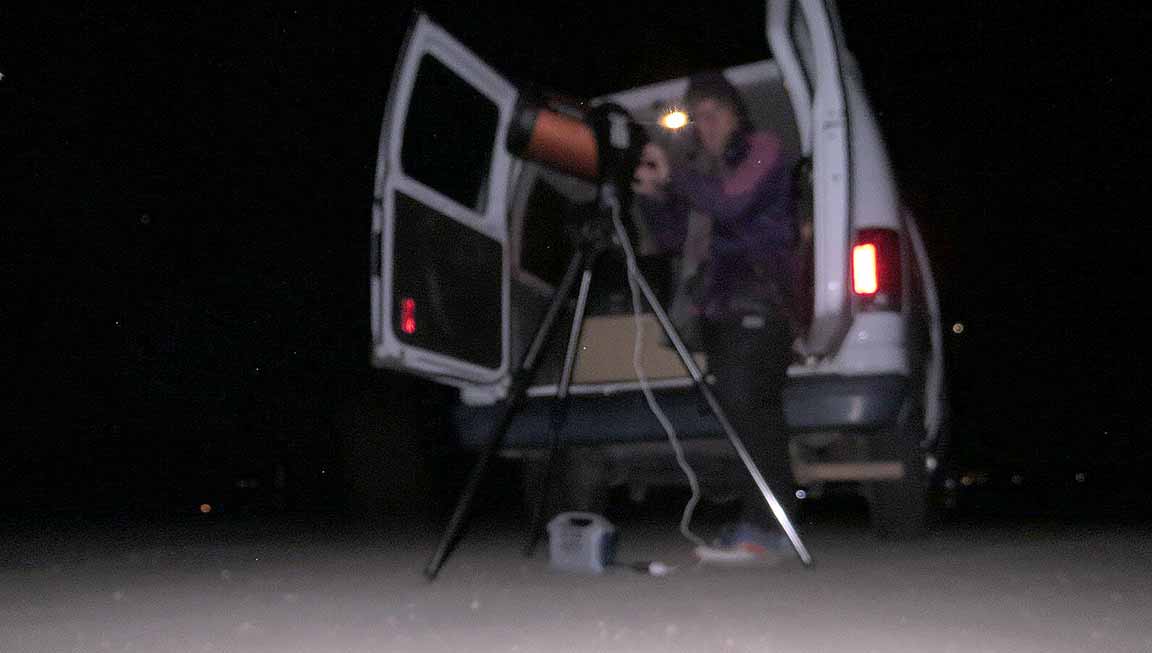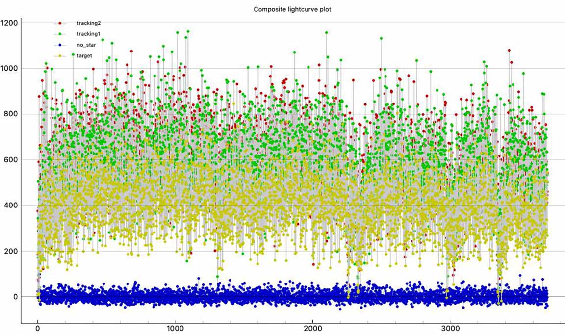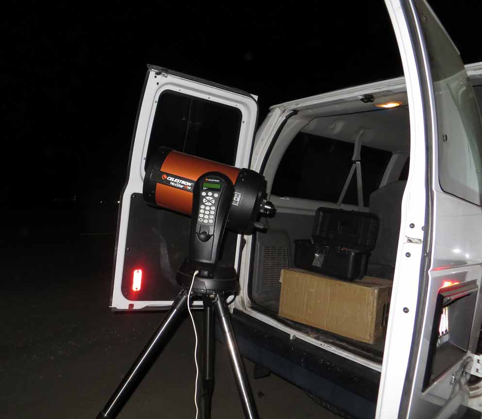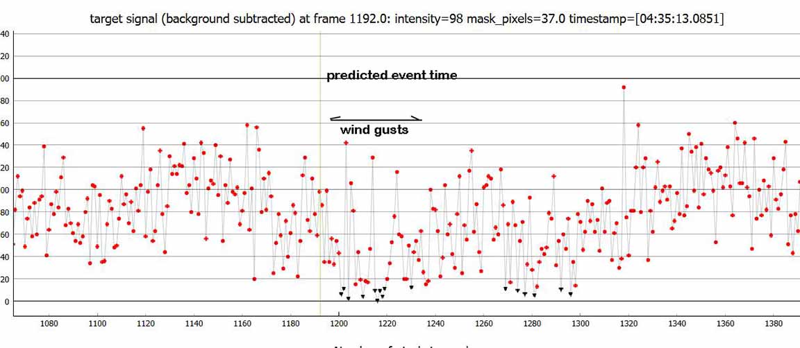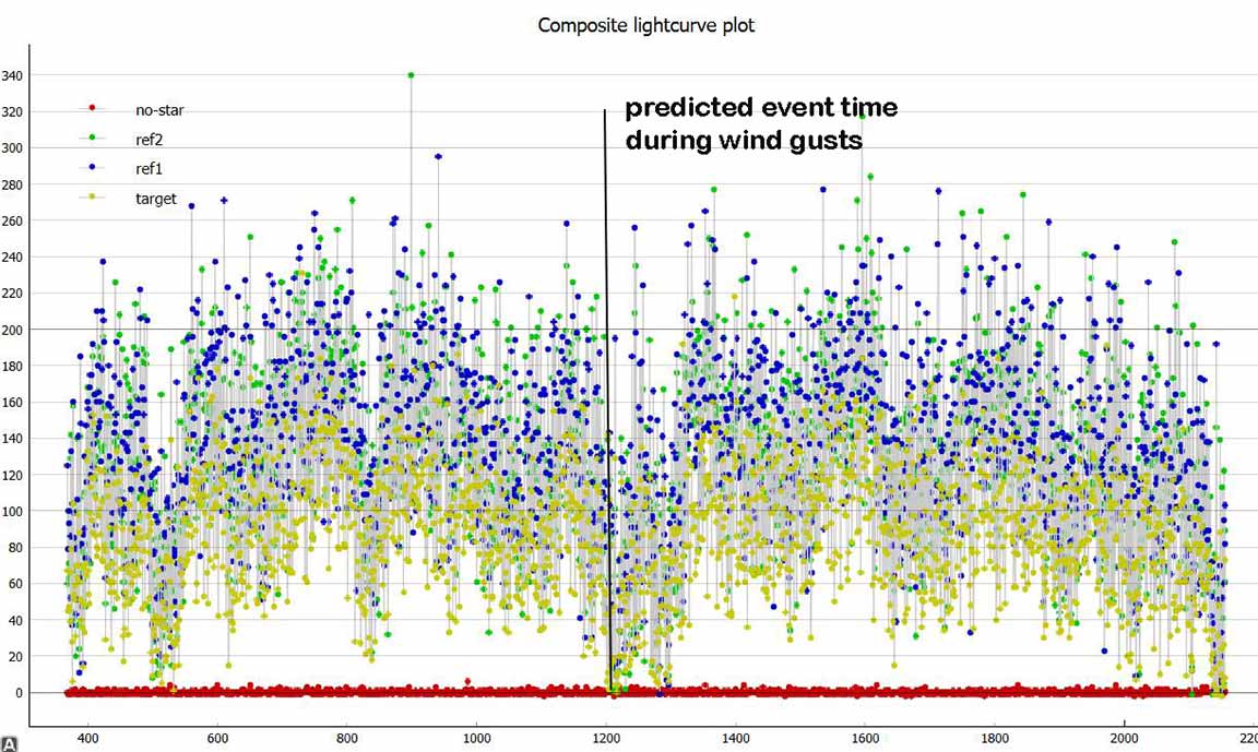 I had a lot of wind, tried the "batman" move during the critical moment, but still had a gust of wind come through right at event time. I used dynamic mask, and PyOTE found an event. which is, alas, noise. Kirk's record was not bothered by noise at the event, and clearly shows the target star on all frames - a miss. My effort will have to go down with a Purple Heart - killed in battle. I did take a few pix of the set up...
