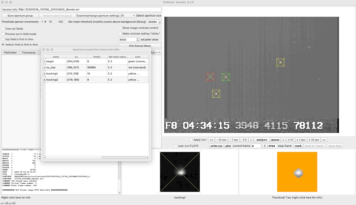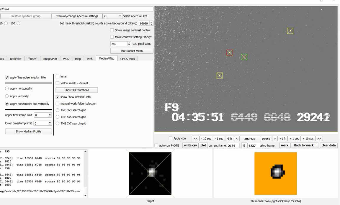 No apparent event for 2001 UM23, 2x, on May 25, from Molera rd. in Castroville. There was a lot of wind shake, minimized as much as I could be shortening the tripod and keeping close to my car. I smoothed out most of the shake on the reference star, but still no sign of an event. PyOTE detectability tool reported an event as short as .15s would be detectable, predicted max was .4s.