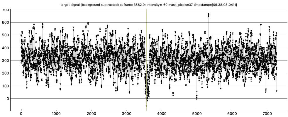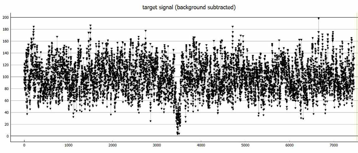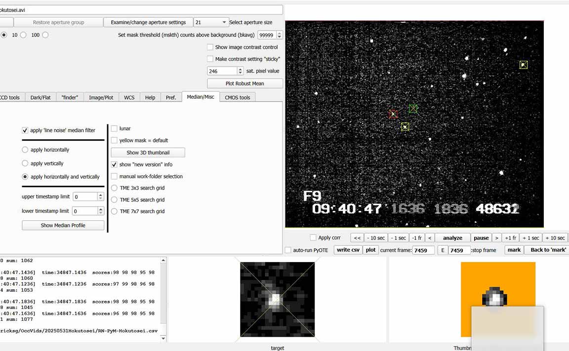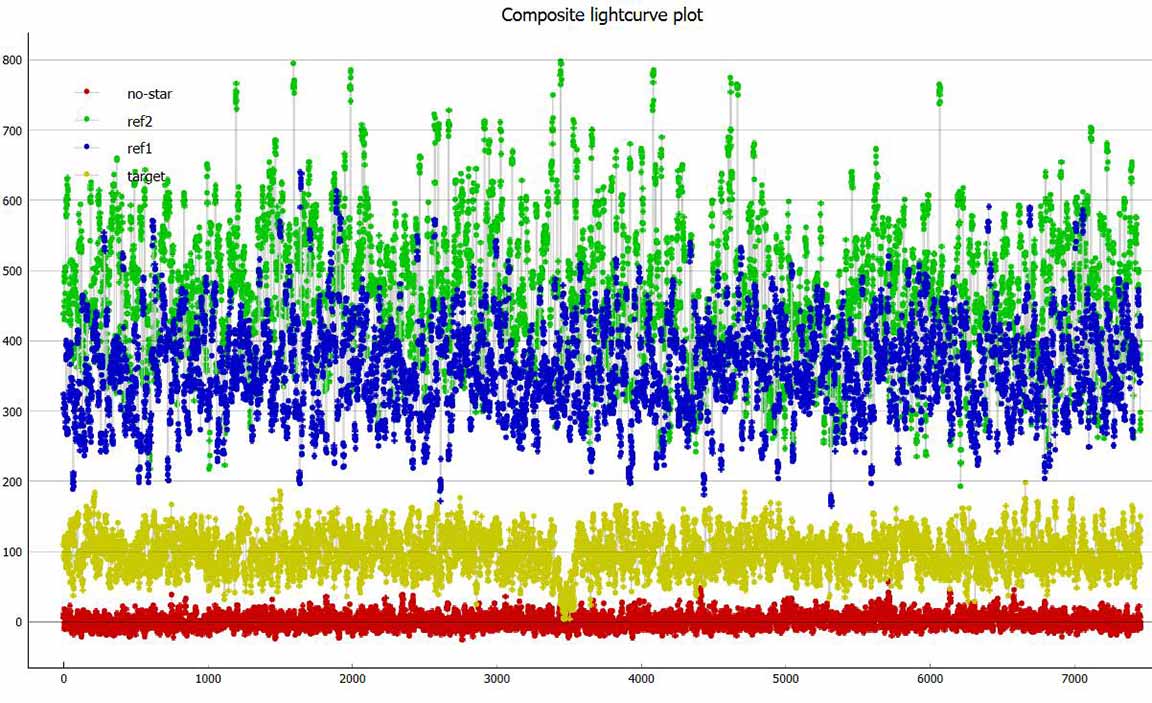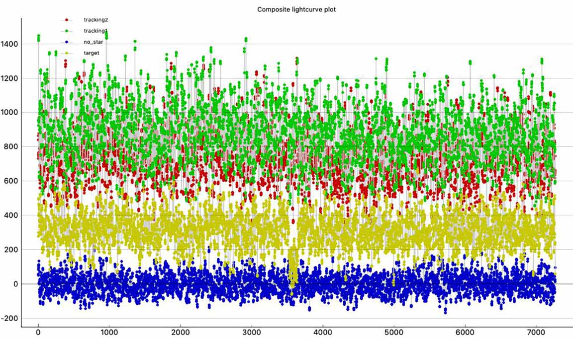 Clear skies, good data at 16x or blocks of 8 points. I probably could have done 8x. I used the camcorder for recording, At Twin Gates on the west side of Empire Grade. Monitor alone at 16x I could just barely see the star. Cirrus in sky, but none seen in target area. Star impossible to see on the flip out monitor. Monitor disconnected.
