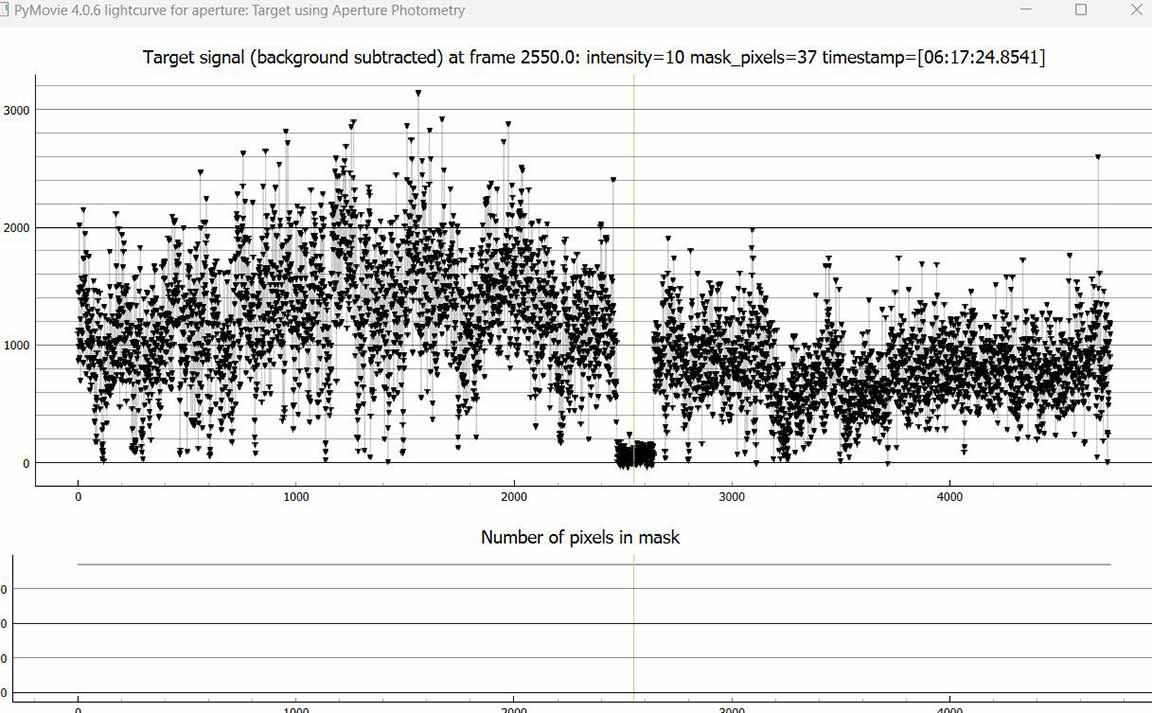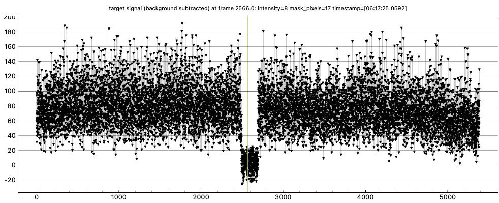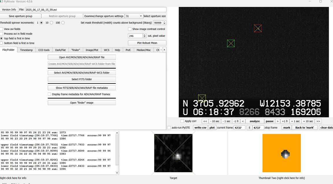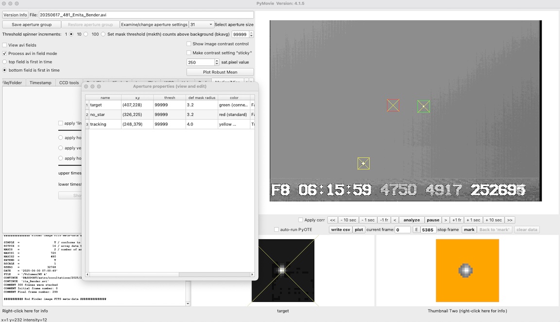 I got a 6.6 second event for Emita on June 16, 1x from home. There were no missing timestamps like Gaussia, which I also did at 1x. There was only one other star to use for tracking and reference. It was bright but I had the gain reduced while recording so it was only occasionally saturated with one red pixel in PyMovie. Since it was so much brighter I've included some plots to zoom in without it.