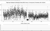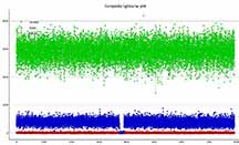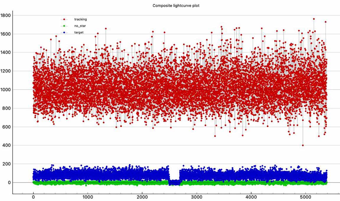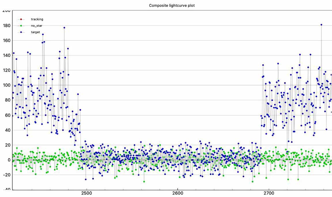 I got a long occultation, from the Ocean St extension SE of the entrance to the mausaleum of the Santa Cruz Memorial Park. At 1x. I see good evidence this was a binary star. The tracking star, unfortunately, was the only star available for tracking, (or reference) and it had a half dozen saturated pixels at many times during the recording. Still, I don't see obvous clipping on the bright side of the noise distribution, so I don't think it's serious. I also don't see any evidence of significant aerosols variations as seems rather common in our light curves. The skies looked unusually clean for Kirk and I. Since there's no real evidence of significant cloud or aerosol. I used the ref star and tracking star as the bright nearby star, and a long smoothing length did help the target flatness. I see distinct steps in the D and the R for my data. The companion star looks roughly about 1/3 the brightness of the total combined light; i.e. two roughly equal brightness stars very close together, in tight orbit. Unless we're looking pole-on to the orbit, it should show evidence of being a spectroscopic binary by the Doppler Effect. I don't know if that has been searched for in whatever Doppler data is out there.