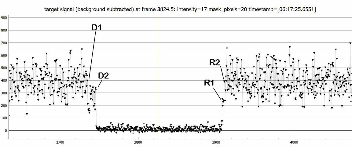 There's strong evidence this was a binary star, not noted as such on the C2A data sheet. It's clearest in my recording, but also shows on Kirk's record for the D, not so clear on the R. Karl's recording is not zoomed properly to see clearly, but it looks like steps in the the D and R in Karl's recording.