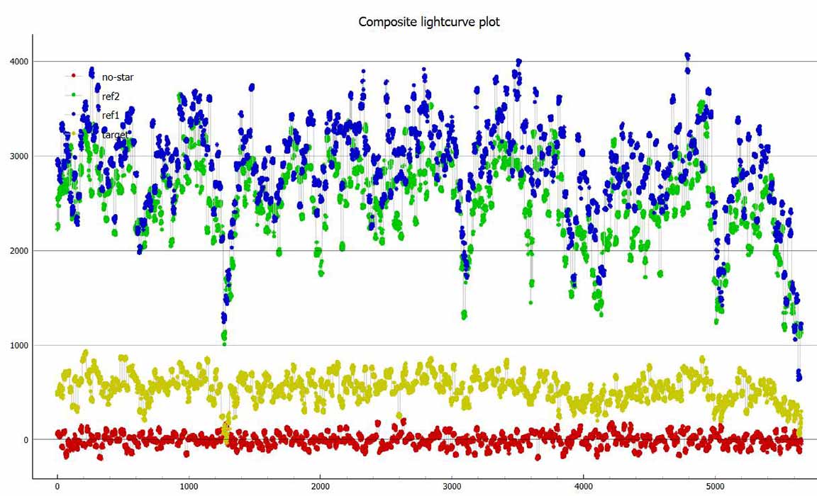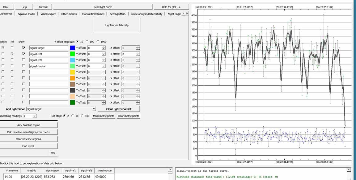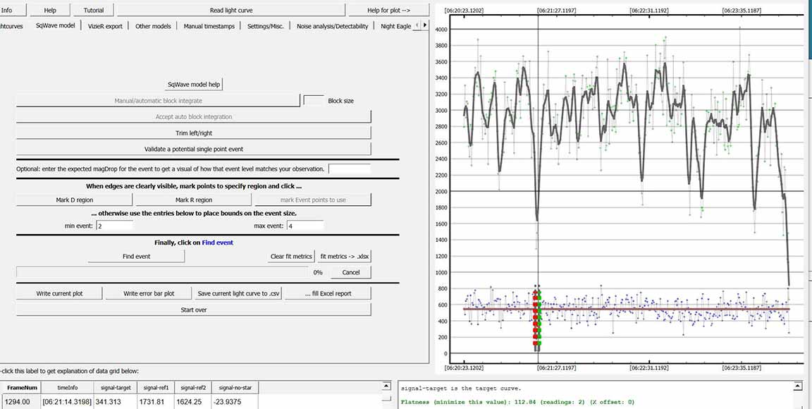 There was a wind gust at event time, unfortunately, but the ref stars only dimmed some, while the target disappeared entirely. The best smoothing length was 2 (!) because the wind gusts caused very short term rattles in light curve. The statistics argue this was real.