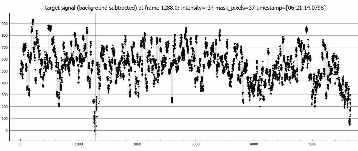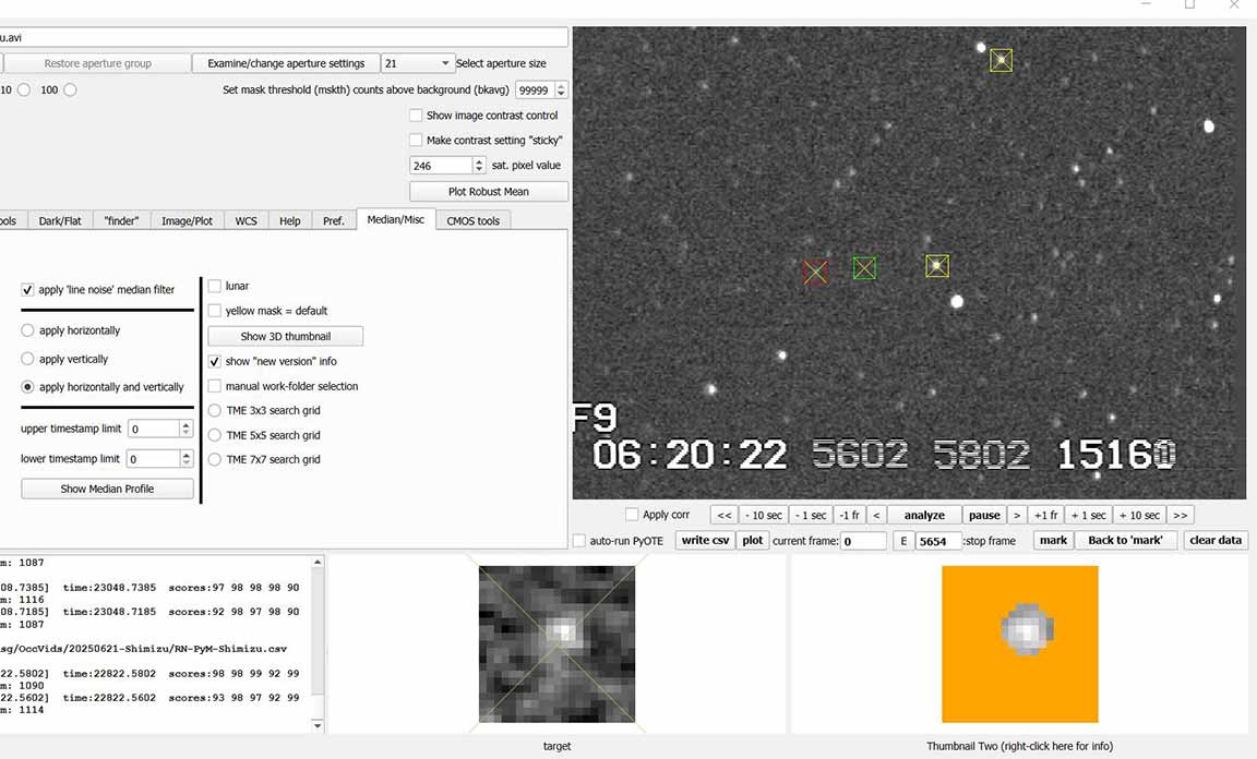 This is a good long event of 2.1s duration. The target star is extremely red. The W magnitude from the Hristo Pavlov formula is 12.3, but might look a little brighter or dimmer because it is quite a bit redder than the calibration stars. The near IR J-band magnitude is 8.5 ! But the B magnitude is 15. The V magnitude is 13.0. From the OWc star data, I calculate W=12.3. But the actual magnitude in the Watec is going to be probably a surprise.