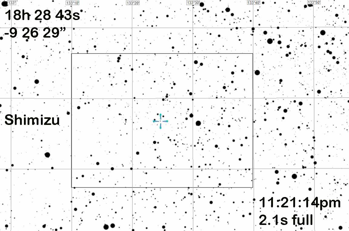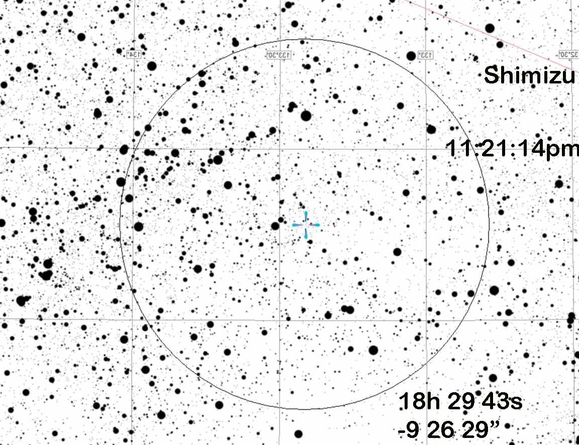 We had a very windy night and so I could not set up at Pine Ridge cul-de-sac as planned. I instead drove first to Twin Gates, but it looked like Kirk was already there, so I continued down to Llama Lane and set up there, 27 feet west of the power pole that's about halfway between the two ranches, and just a bit west of the faint curvy 2-track that I have used in the past. There was no wind trouble during the event. But the target was much fainter than I thought it would be, and the seeing was variable and focus was a struggle to find an optimum. But at 32x it was clearly obvious. I set gamma=1 (it was gamma=0.80 for the 2000 SL45 event 80 minutes earlier) because city lights in that direction were still making sky light at 32x a bit of an issue. I saw a clear 2s event on the monitor, which remained attached during the event.