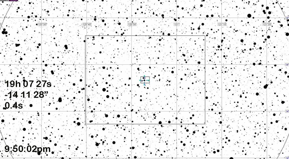 Not an easy event, at alt=18 degrees and only 0.4s duration. But won't lose sleep at least. In Sagittarius, above the Teaspoon, and 12 degrees below left of the Aquila tail feathers.