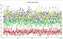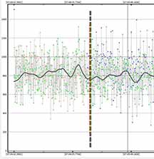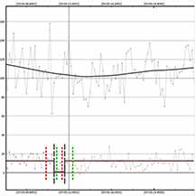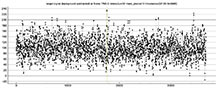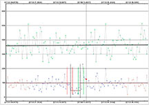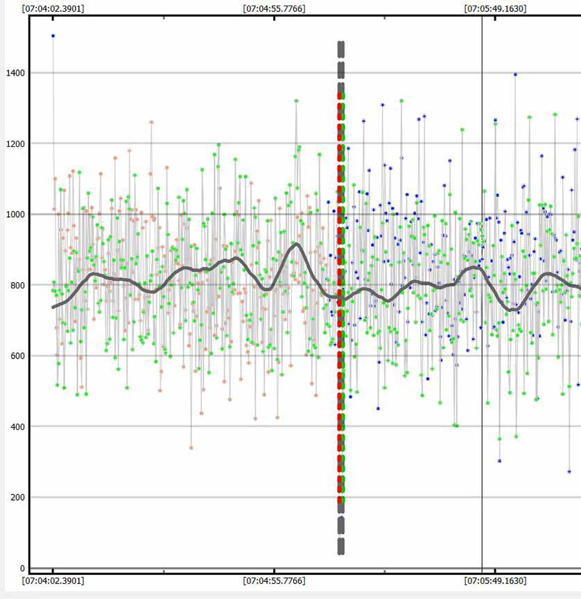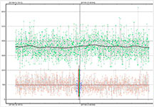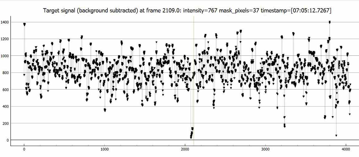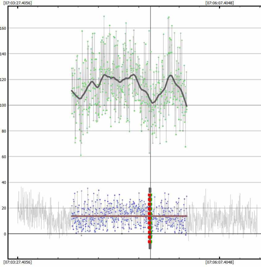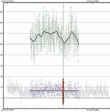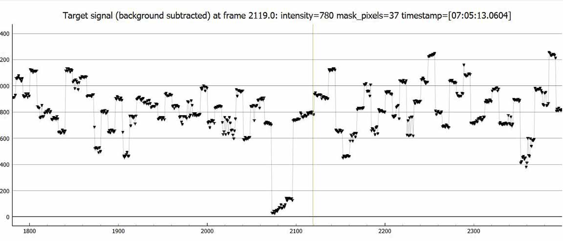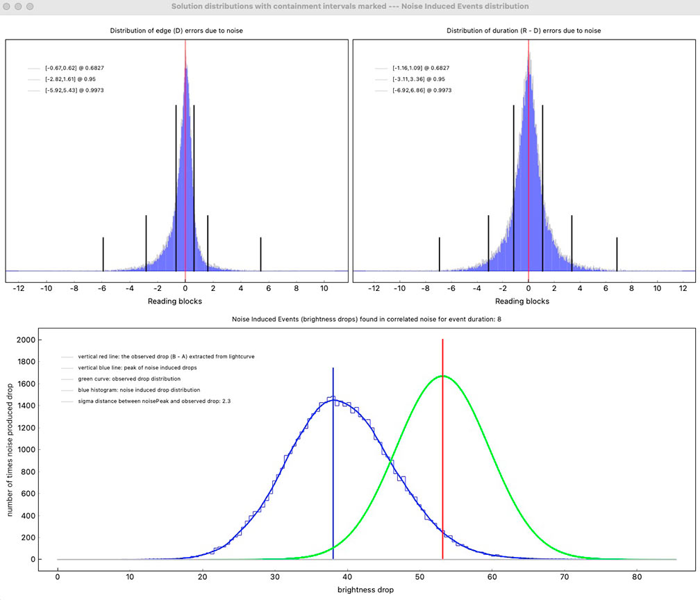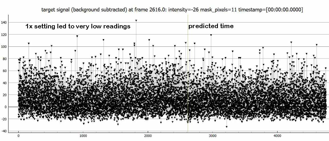 The solution was to artificially block by 8 readings. This isn't as good as doing an 8x setting right away because I'm still ending up with the read out noise. But, it was better than no blocking. I could see an event at the correct time, but zooming in it was quite noisy. In order to prevent a false ID at a spot 1 minute before the event, and risk the same 1 minute after the event, I trimmed out the data with false positive and kept just the minute or so that was centered on the event. This hurt the NIE value, which was only 1.4 sigma. However, from a chord not far from my own, Karl von Ahnen had a very solid positive also 0.80s, from home - and so I do believe I must have had a positive at my site. We were only a few tenths of a mile apart cross-track. My accuracies are not great, but the event found was at the predicted max of 0.8 seconds