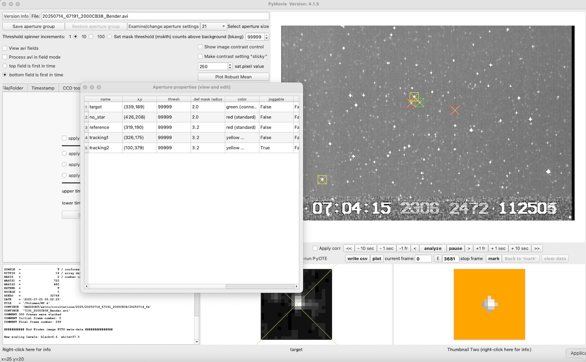 I got a .5 sec positive for 2000 CB38, 4x at Sunlit Lane, July 14. Light curve was noisy, but PyOTE found an event. I tried several size apertures, best results were with a 2.0 size mask, it gave a NIE sigma distance of 2.3.
