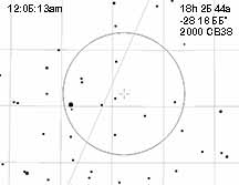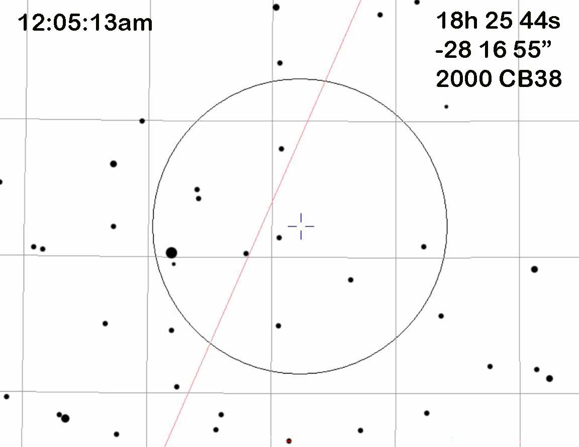 July 13/14 12:05:13 2000 CB38 from East of "The Rock". Clear, average seeing, no moon (or v. low behind trees). Shot at 16X, visible short blink.
