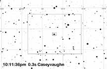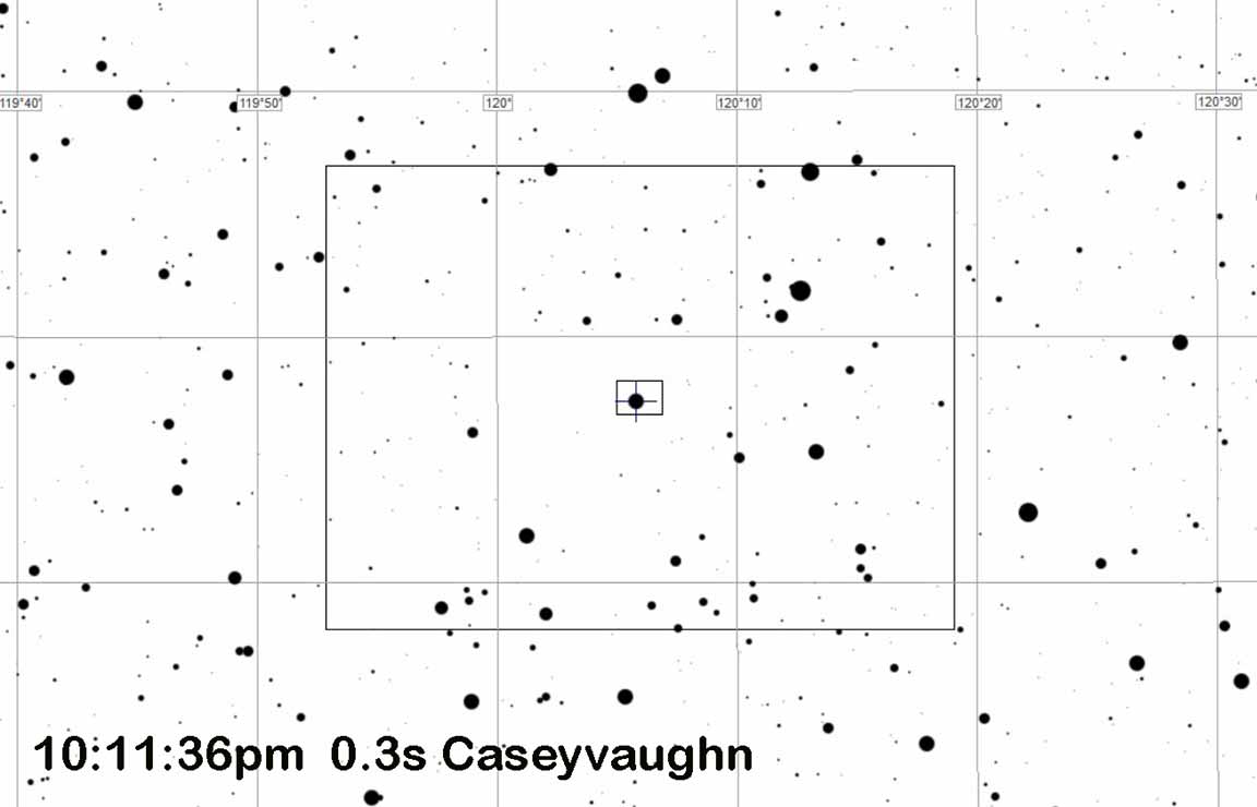 I cannot ID any star pattern on my event recording that matches another recording taken a few minutes later when I did ID the field not too far away. No stars matched that I could tell. I believe I just did not have the target on-chip at event time. I did not have time to do the usual ID of the field with the wide field eyepiece first, then swap in the Watec. I put in the Watec and did a GoTo, which I believed would be accurate based on (while waiting for it to rise above the trees) successful GoTo's to M11, M4, M22. But, it did not work.