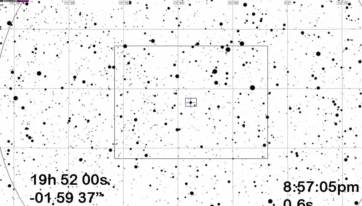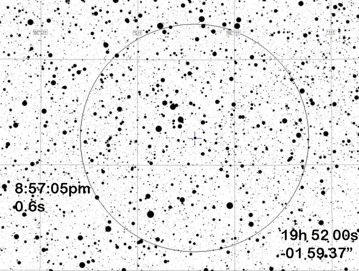 Skies were clear from Santa Cruz. I was "under the weatther" and the difficulty of the task had me at first intent on skipping entirely. But Kirk and Karl were game to try it, so I felt duty-bound to at least get a possibly useful "miss" from home, given how the formal path accuracies are not as good as advertised anyway. And, I was curious if sun=-8 would be entirely fatal. I observed from my carport. Got a 2-star align with Vega and Altair, did a GoTo and immediately recognized the two bright stars near the bottom of the eyepiece chart which told me I had a very good GoTo. I shold have waited to see if there was any drift from there, but at this point there was only 7 minutes till the event, so I instead just swapped out the eyepiece for the Watec and powered up the laptop and OccBox and, use the brightness control in the IOTA VC 2.4 to dial down the blindingly white pixels. Still not successful until I also dialed the Watec down to 1x setting. Then I could see stars. Focused, and.... could not ID any patterns. The stars turns out had been drifting upward quite a bit during all this. I did not get on-target until 4 minutes after the event. The target was then visible, and might have been above-sky at event time too. But, just not enough time to get this one done.