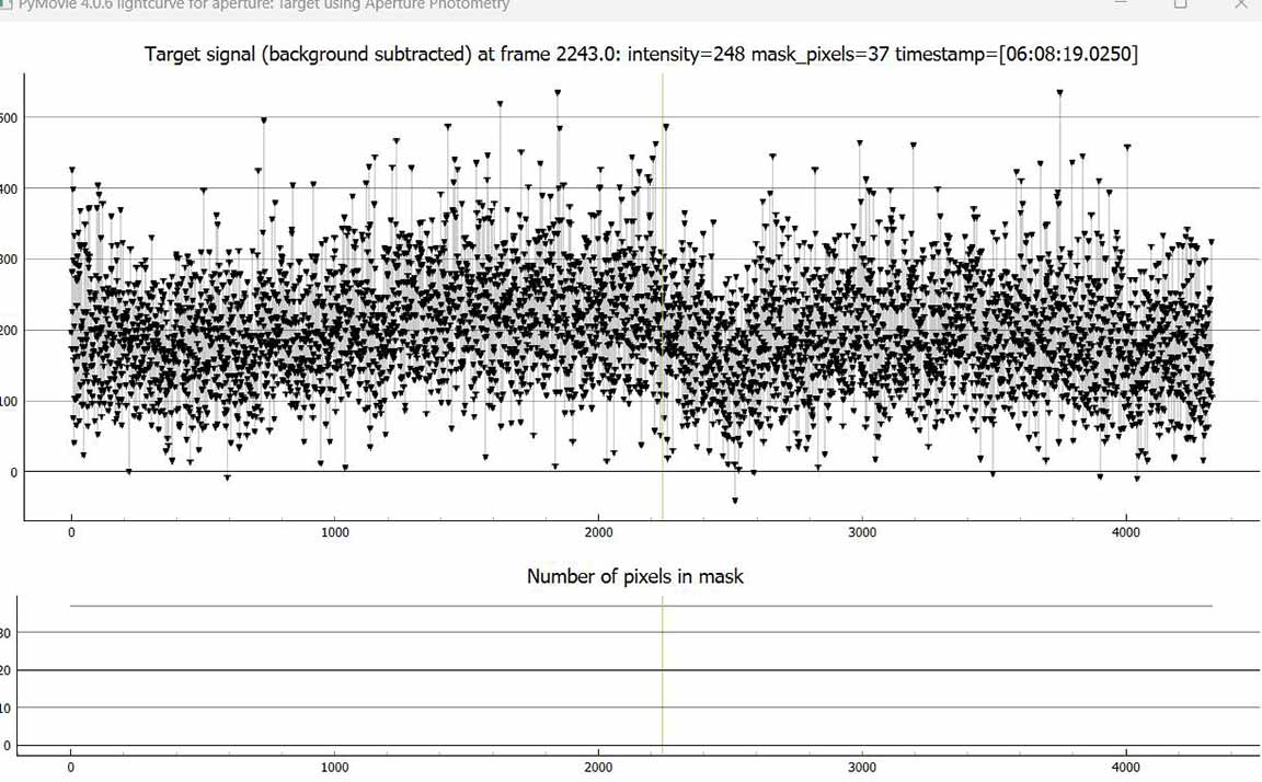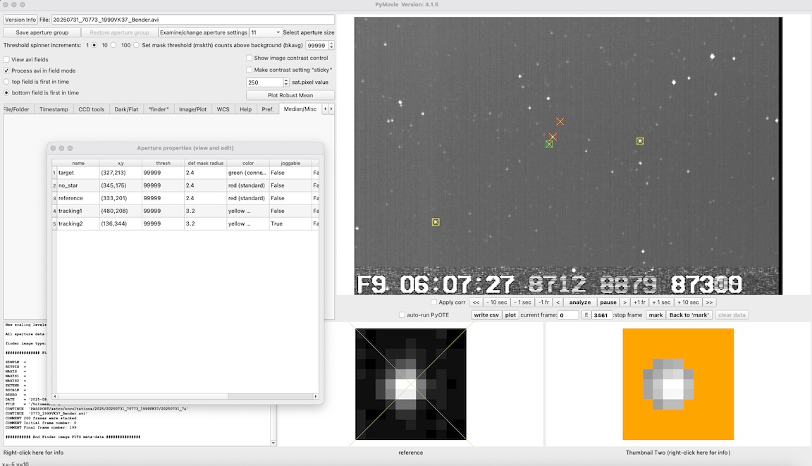 Looks like a miss for me for 1999 VK37, 1x from Bonny Doon church, no apparent event. It looked doable at 1x, and I can see the target consistently on playback, but the target level is close to background. The seeing wasn't great, and I turned down the gamma to see the target better, so both target and background are noisy. I probably should have gone with 2x and still have had enough integrations if it was a positive. The target was close to another star, so I used small size 11 apertures. The PyOTE detectability tool reported that with my data an event as short as 0.35s was likely detectable, but maximum predicted duration was 0.32s. The PyOTE help says it's a no-observation if the shortest detectable event from the tool is 1.5x predicted, presumably to allow some leeway for the prediction, so according to that mine is not a no-observation. So a miss or undetectable.