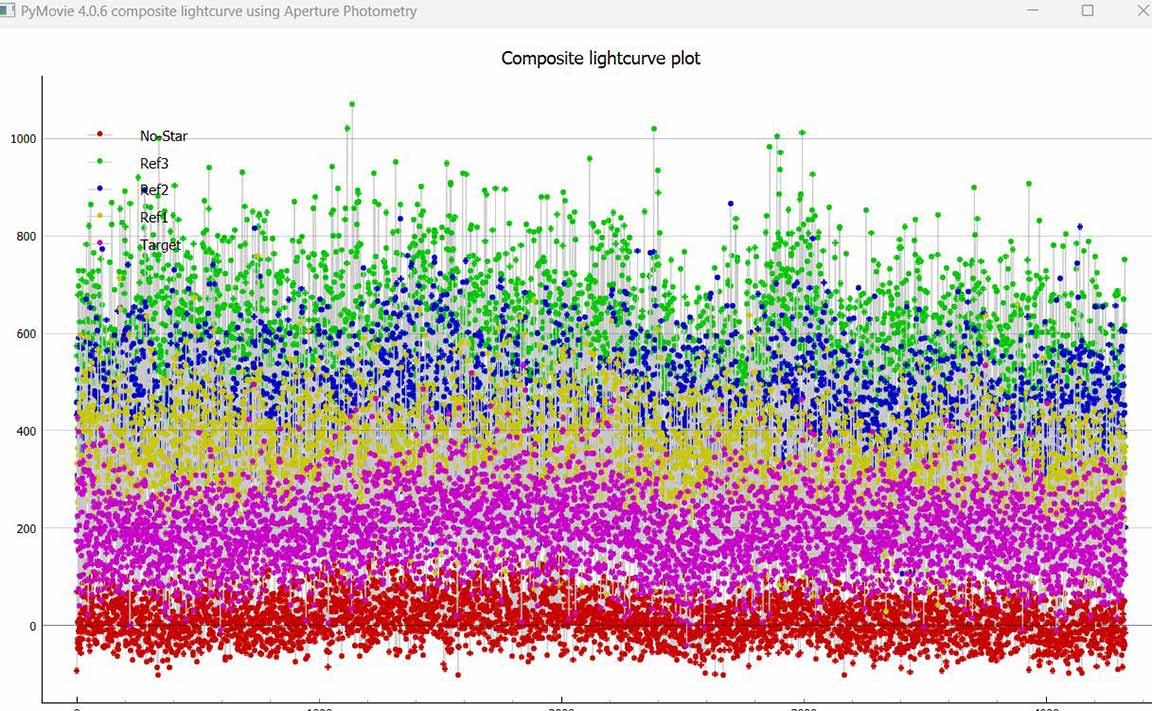 RN: Since the target even on it's bigger long dips, never went close to zero, this looks like a miss but with poor calibration. The light curve looks like it has an event, but the light curve of the target is not flat anywhere, and the "event" does not go to zero. It would be good to see "sky" plotteed as well. The constant varying in the target suggests not properly calibrated, apparently there was very different obscuration happening over the target vs over the ref star. Was the ref star rather far away from target, and was there fog or clouds that were fine-scale and so they were not affecting the ref star and the target star both near the same times? If so, then it's essential to use a ref star that is much closer to your target star. Even if the ref star is not the optimum brightness we'd prefer. And it's essential to also optimize the x-axis (the time offset) when minimizing the flatness metric in PyOTE.