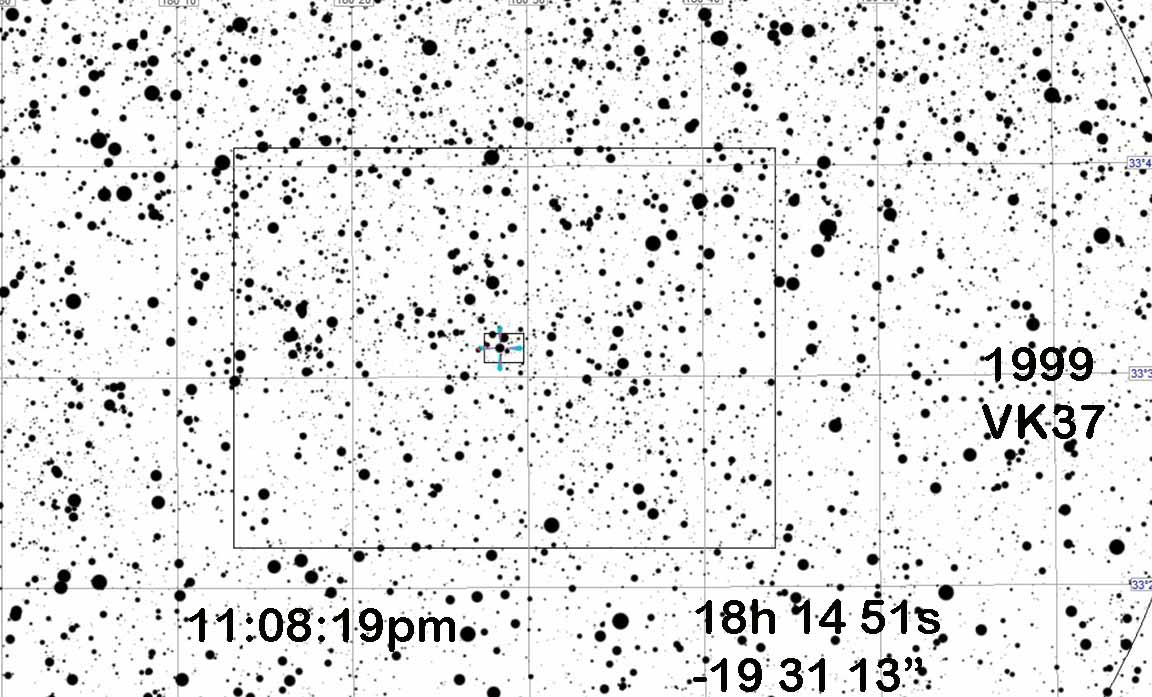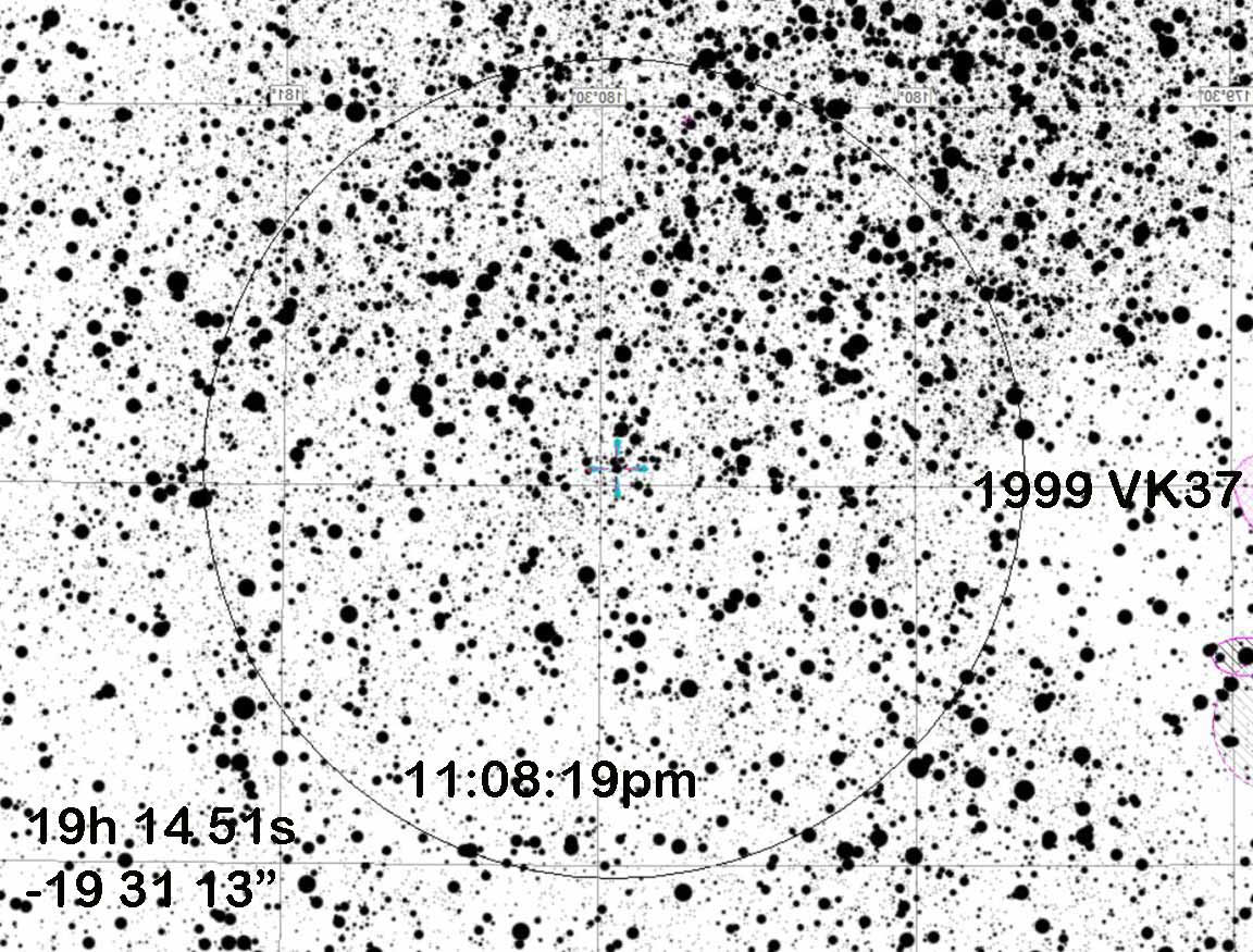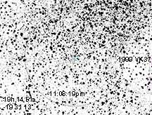 Planned to observe from Watertruck Turn 11:08:19 1999 VK37 from rock, clear, dark, ok seeing, no wind, used 2X. Moisture level rising, fog come in moments after we broke down, No noticeable blink. Processing: Pretty obvious miss. A dip 9 seconds after the predicted time looked possible, but PyOte found a less likely looking event about a half minute before. I declare it a miss!