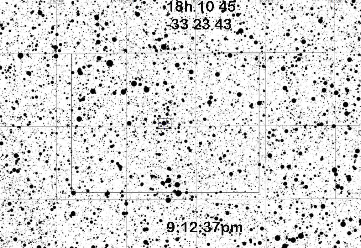 Alt=18, Az=166 on the right edge of the "spout" of the tea kettle, and 4 degrees to the left of the big open cluster M7 in the tail of Scorpius