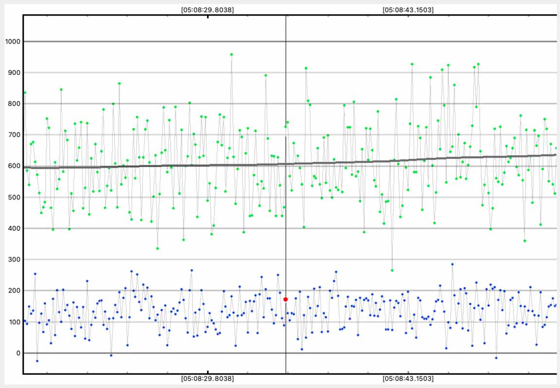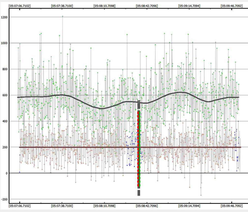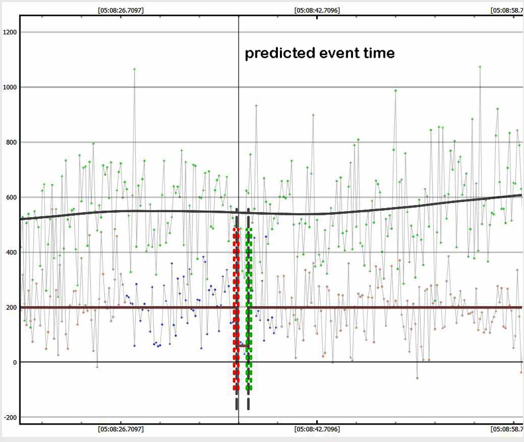 The drop in my data that's 8 points later than the predicted line is at 05:08:36.0766. The signal is value=11.5 at that point. There are several single points lower than that throughout the curve though. My point is a little before RN's D at 05:08:36.1497, but within the confidence intervals.