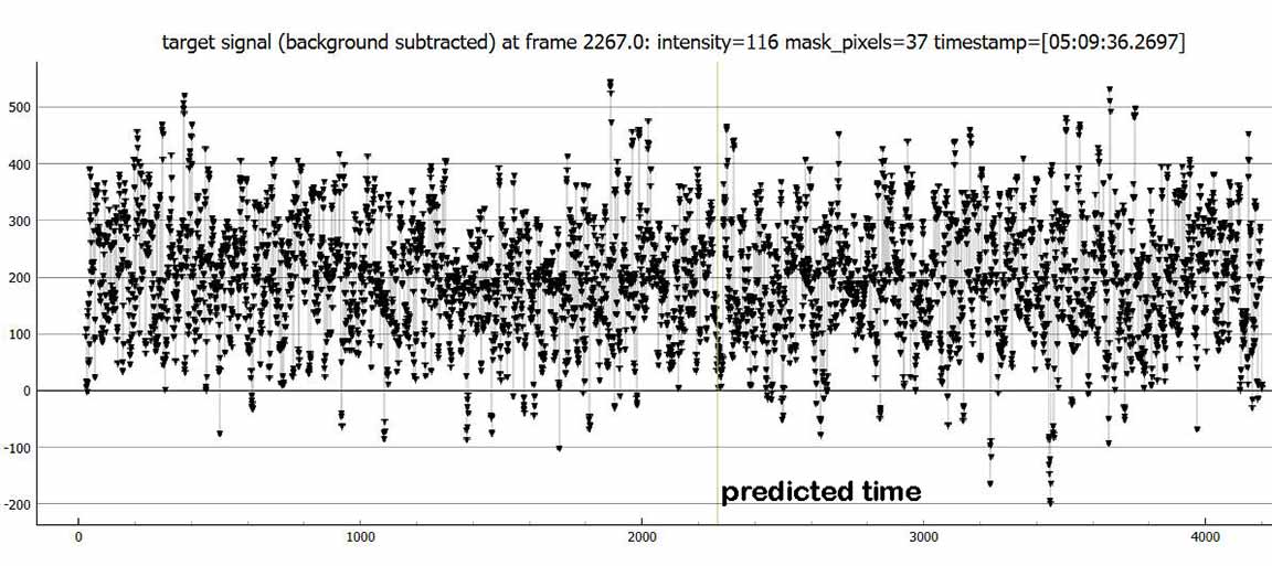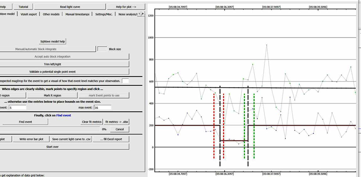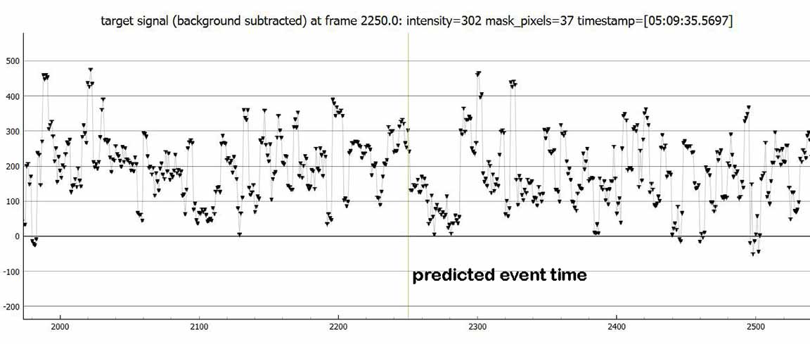 RN: KvA observed from home. The one dip after the predicted time is suspicious, since RN's event was also late. Cannot tell from the submitted PyMovie masks whether they were optimal or perhaps too big and hence noisier than necessary. Karl's location was about .1s after the OWc time clicks over to 5:08:36. Frustrating that OWd and OWc don't give event times to a fraction of a second.