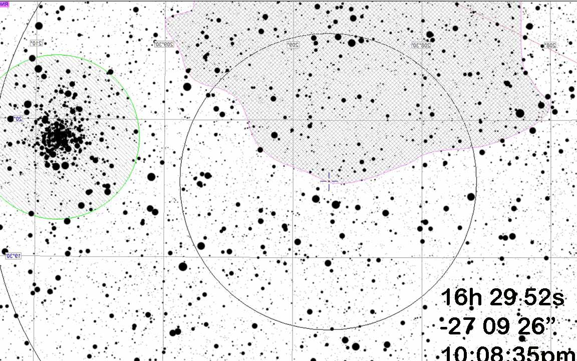 Alt=17, Az=212. In Scorpius, just 1 degree below Antares and 1 degree left of globular cluster M4.