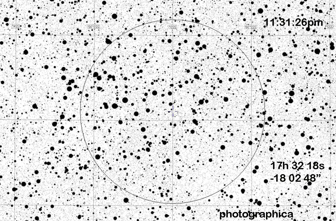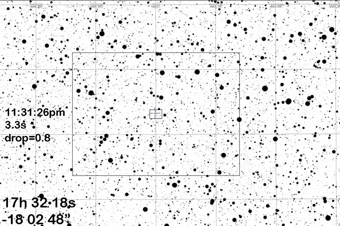 This event is high rank and covers all of our team. Karl is inside but near the northern limit. The duration is a nice long 3.3s, allowing some integration to get a decent signal. The target is in Ophiuchus, just a degree or two below the bottom star on the left side of Serpens. Beware the drop is only 0.8 magnitude, and the combined image is 13.0 magnitude so it should look brighter than the neighbor star on the chart.