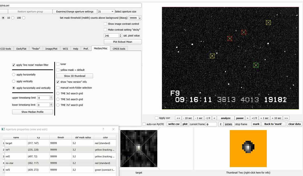 I tried this from Twin Gates, on the eastern side parking spot, near the gate. I forgot to click 'options' and change the default EIA resolution to PAL resolution, so there is only 640x480 pixels. That caused the OCR boxes to be off quite a bit. But since OCR reading is terrible anyway and I must always use manual time stamps when I get to PyOTE, it really didn't matter, otherwise. I used 8x. And I did not change the default mask size of 3.2px. Static circular apertures. And, there was no "black bar" issue visible during the reductions watch on screen.