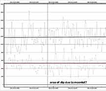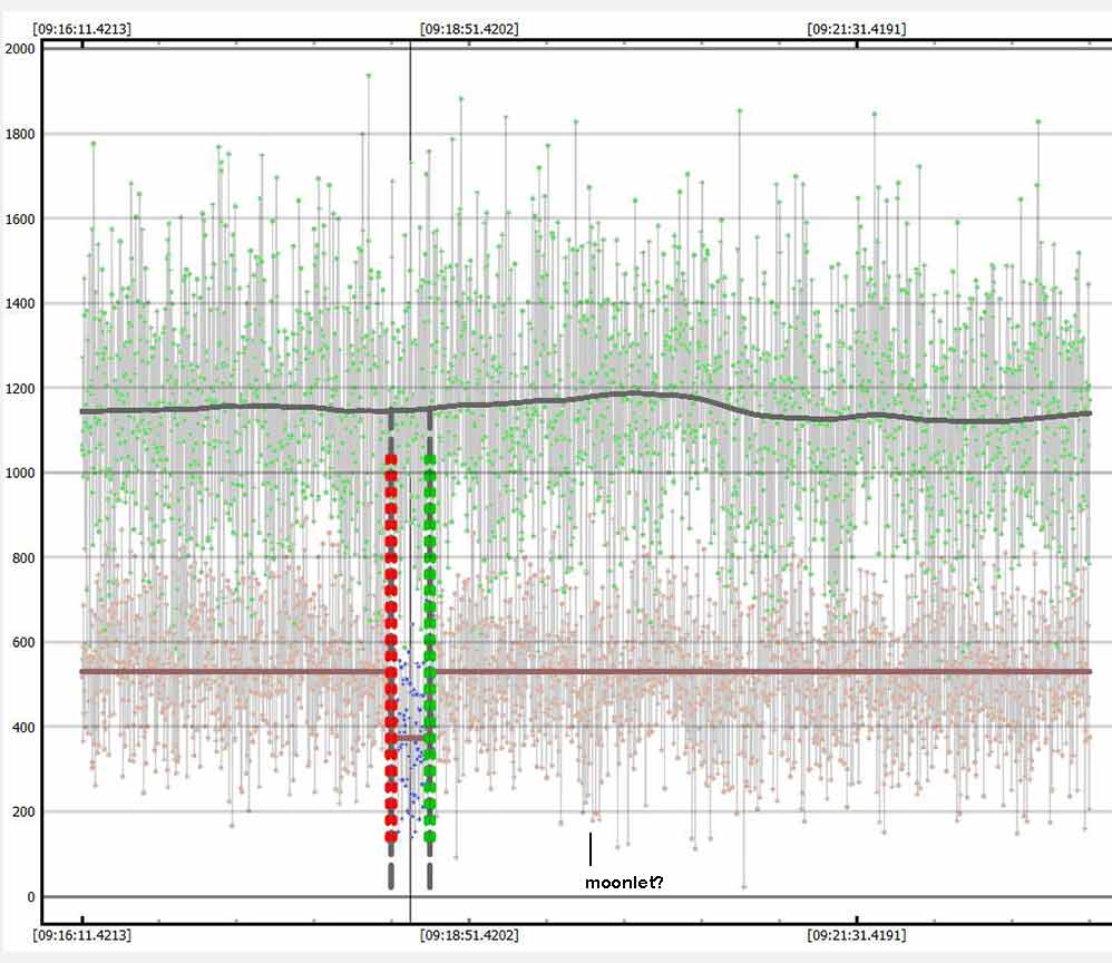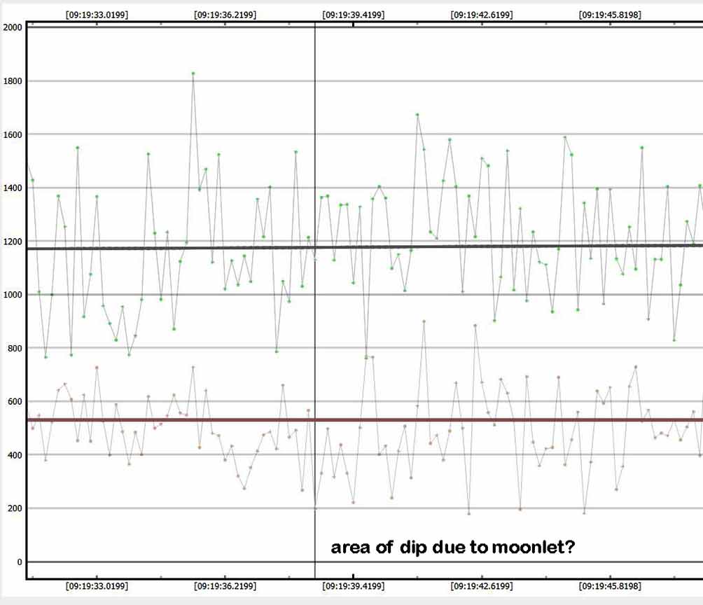 The most likely candidate for a moon event is shown as one of the zooms on PyOTE. Given the small drop, it makes it difficult to evaluate. I will wait for Kirk and Karl's data to decide if there's support for it. It's about 4 diameters after the main event.