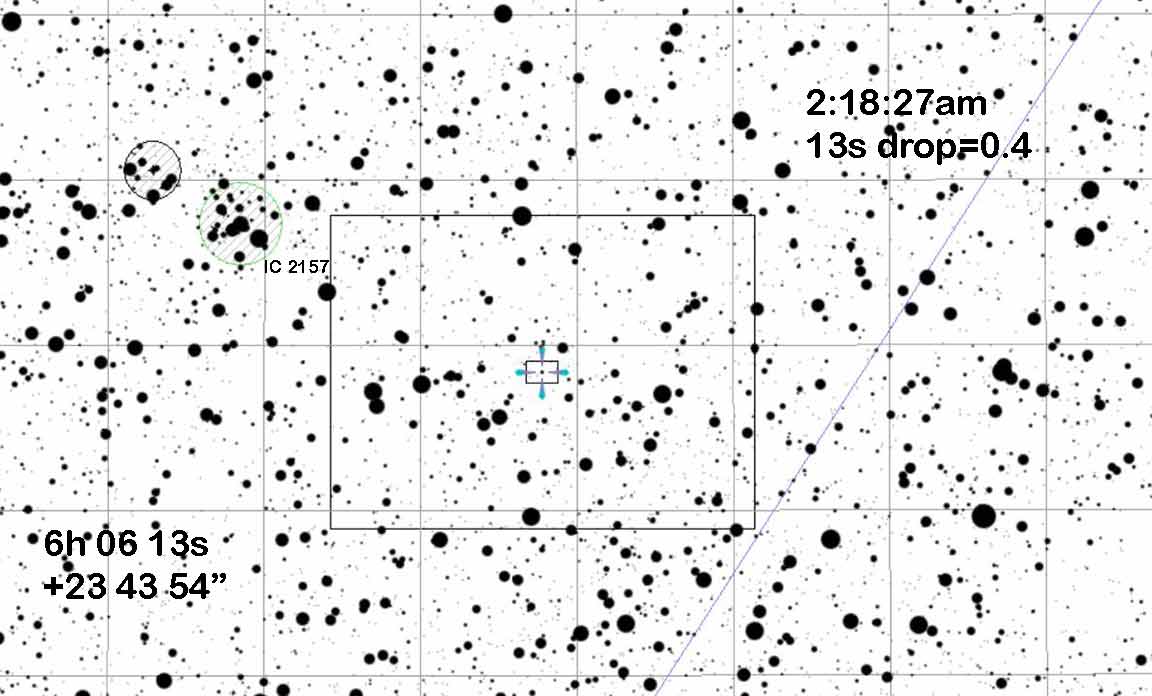 This is a high value event as we have the possibility of spotting an event by it's moon. I don't know where the moon shadow prediction places it, or if we know the orbit well enough, or even the existence firmly, but it is listed on the OWd feed as a binary or even triple asteroid. It's a long event, 13.2 sec, but shallow, only 0.4 mag drop. The event is very close to M35 in Gemini, less than an eyepiece field away.