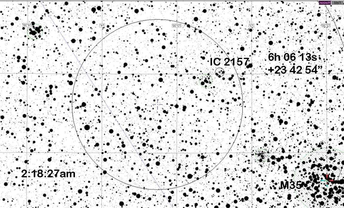 Alt=22, Az=75, at the foot of Gemini, 1 degree from M35, and closer to open cluster IC 2157