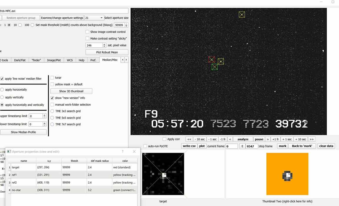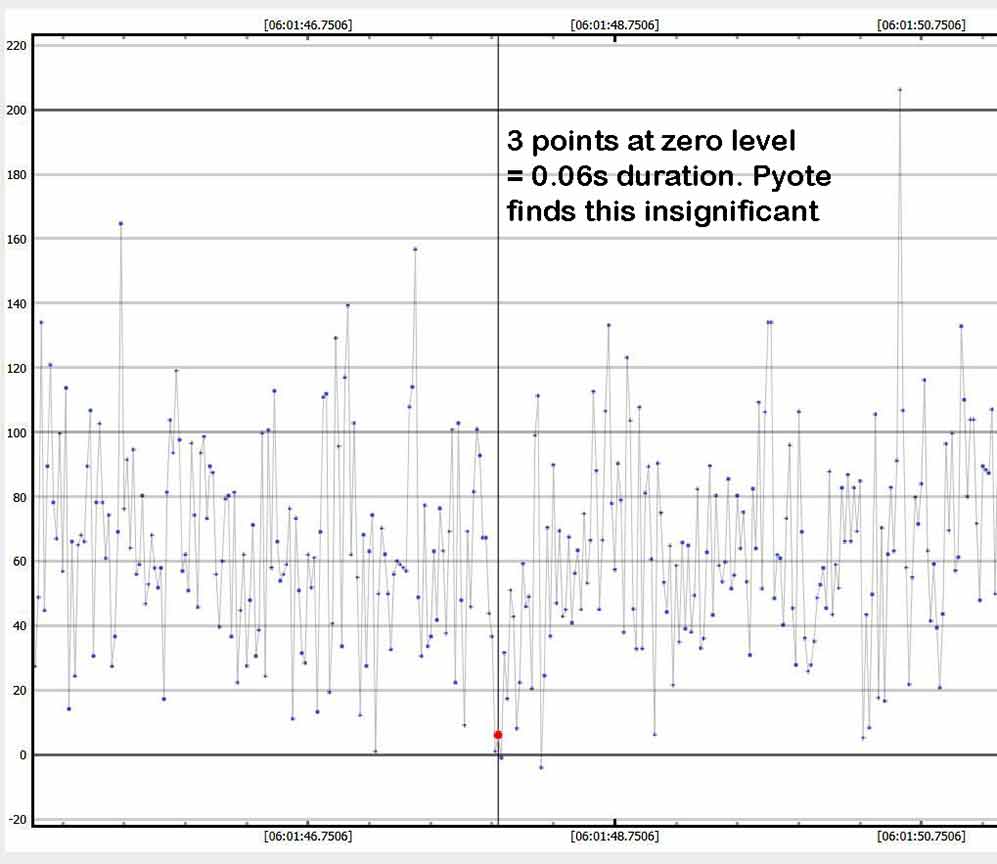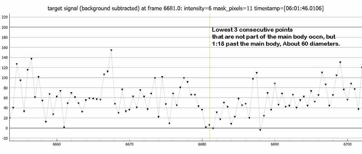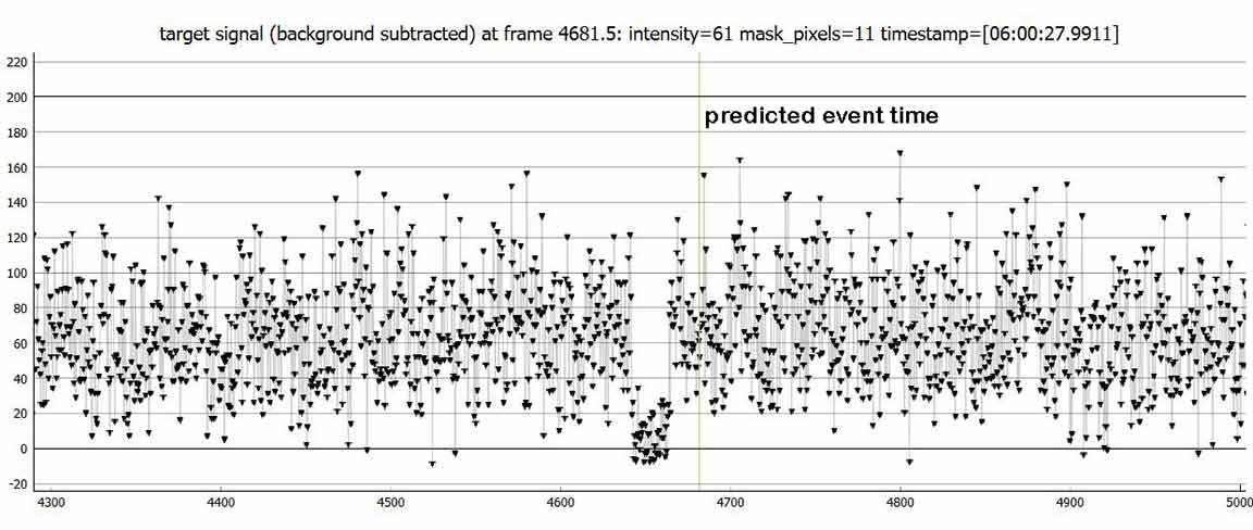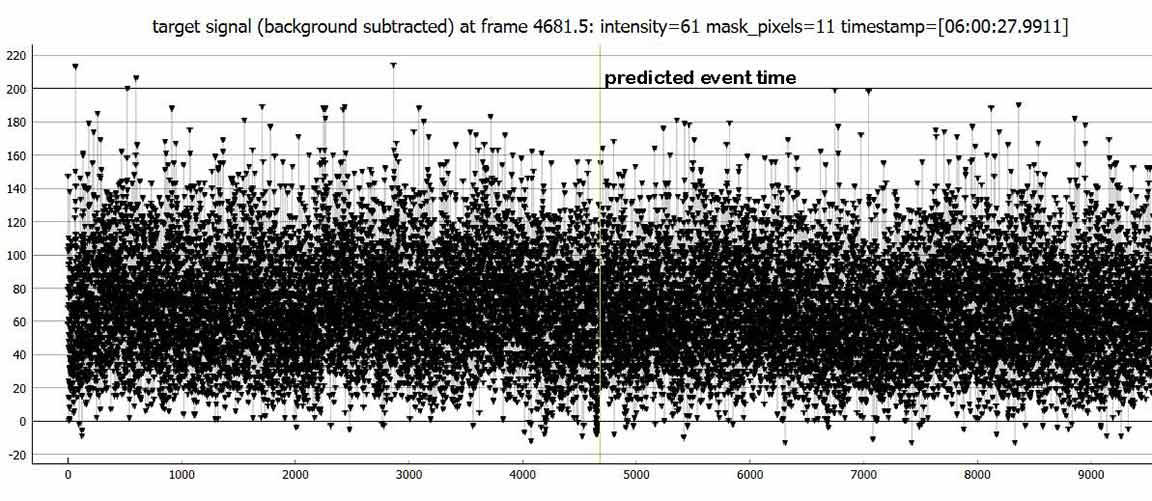 I recorded at 1x, once again had to do manual time stamps, even though this time the sky was quite dark. I don't know why PyOTE is unable to OCR my numerals. But, the event was easily found and good solid accuracy. I searched for any hint of a satellite. There was one other place with 3 consecutive zero points, but rather later than one would expect. I'll mention it in my IOTA report.