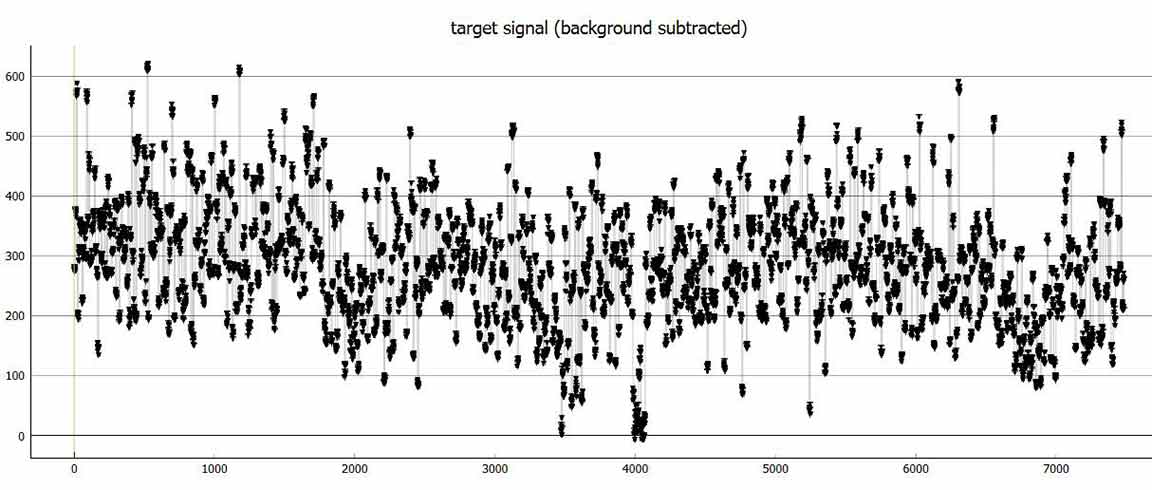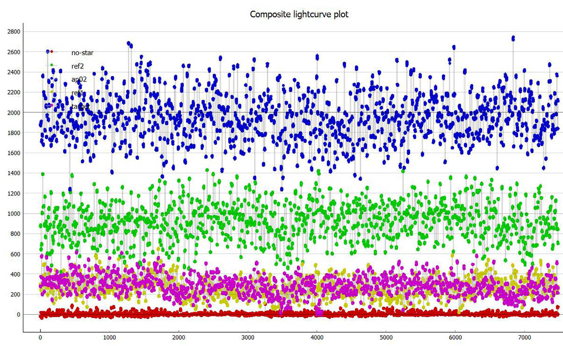 However, I see a dark bar across the middle of my chip field, and especially near the top of this bar, brightnesses of all objects are cut down. This caused the spurious drops in brightness, and probably not aerosol/clouds. I'm re-doing the analysis and this time using the ref star very close to the target and almost level with it, to try to minimize the differential drop in brightness by this chip problem.