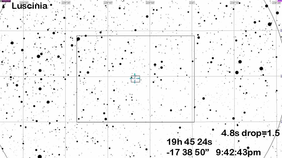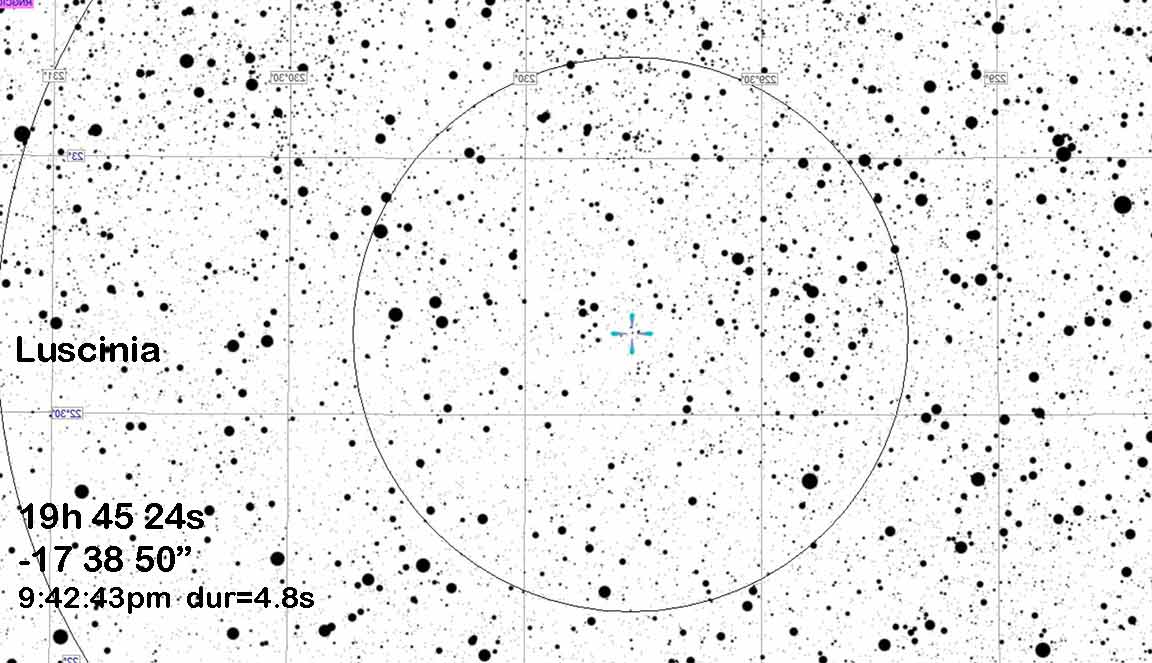 This event is just 50 minutes after another event well seen from Karl's - Analucia. My preliminary suggestion is to have an evening at Karl's and get both from his place. Luscinia is visible, however, from all of Santa Cruz County. But Analucia is only visible from Karl's and north, and Pigeon Point (where Kirk will be).