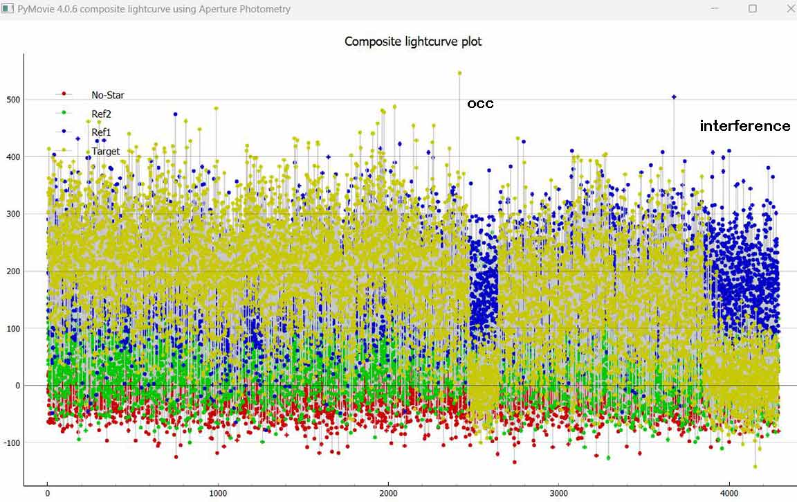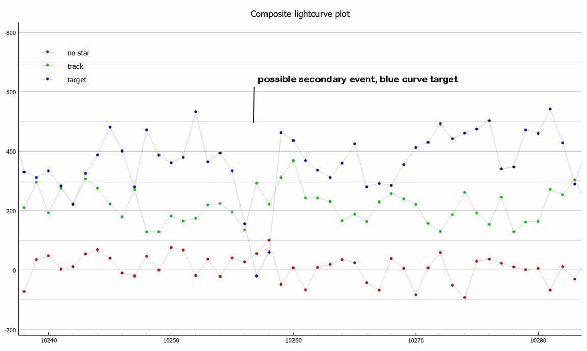 Observed from the "red realty" place on Hwy 17 south of Summit Rd/Hwy 17. The closest chord was mine, north of him but this possible secondary event was only 0.0359 seconds which is 1/200th of the primary body, and so anyone more than 1/200th of the spacing of the shadow path would be likely to have not seen this event. None of our chords were at all close enough to confirm this event. PyOTE found the event easily, with these timings.