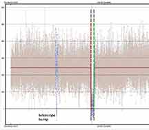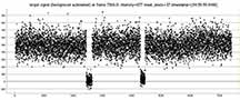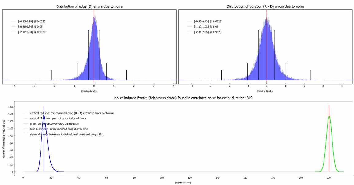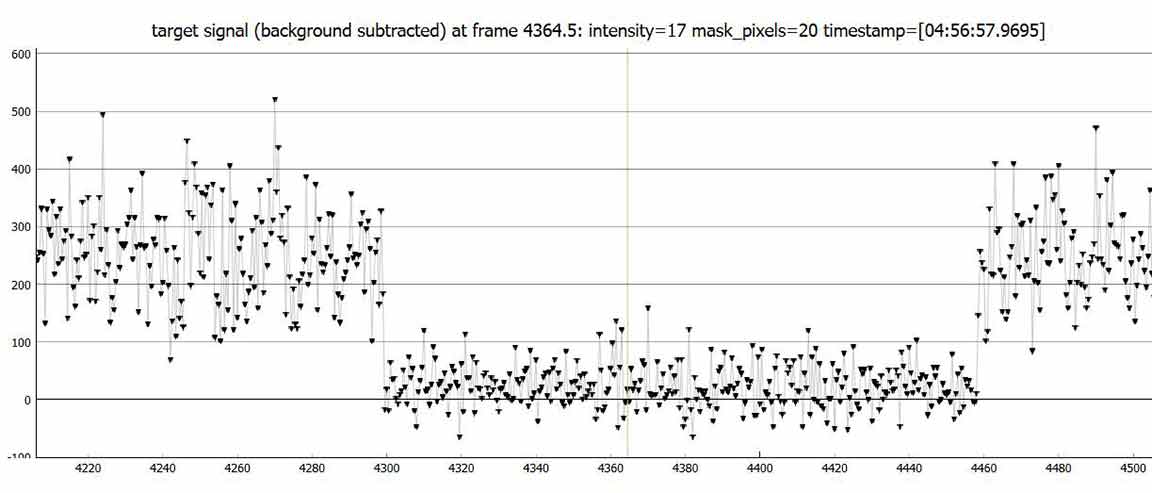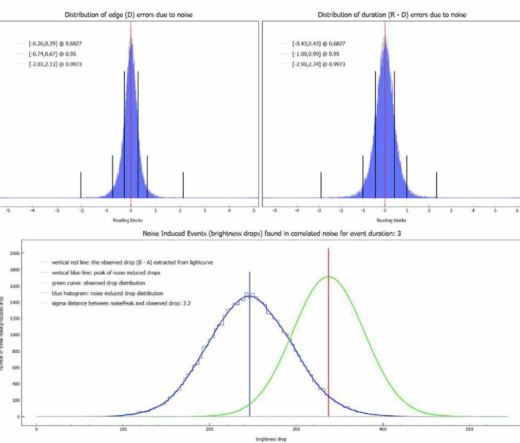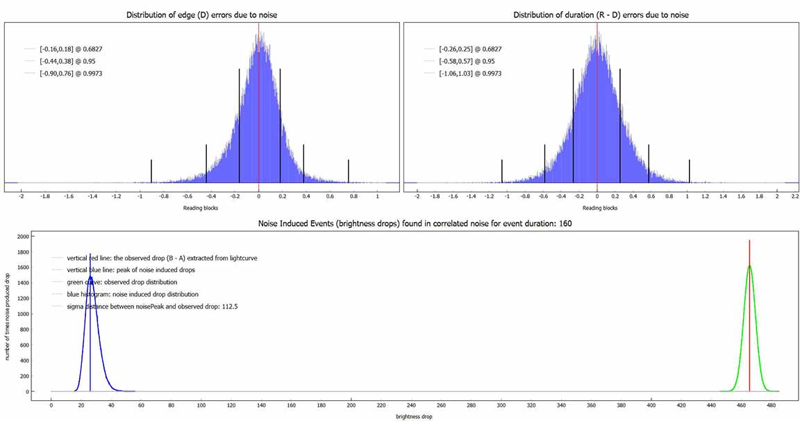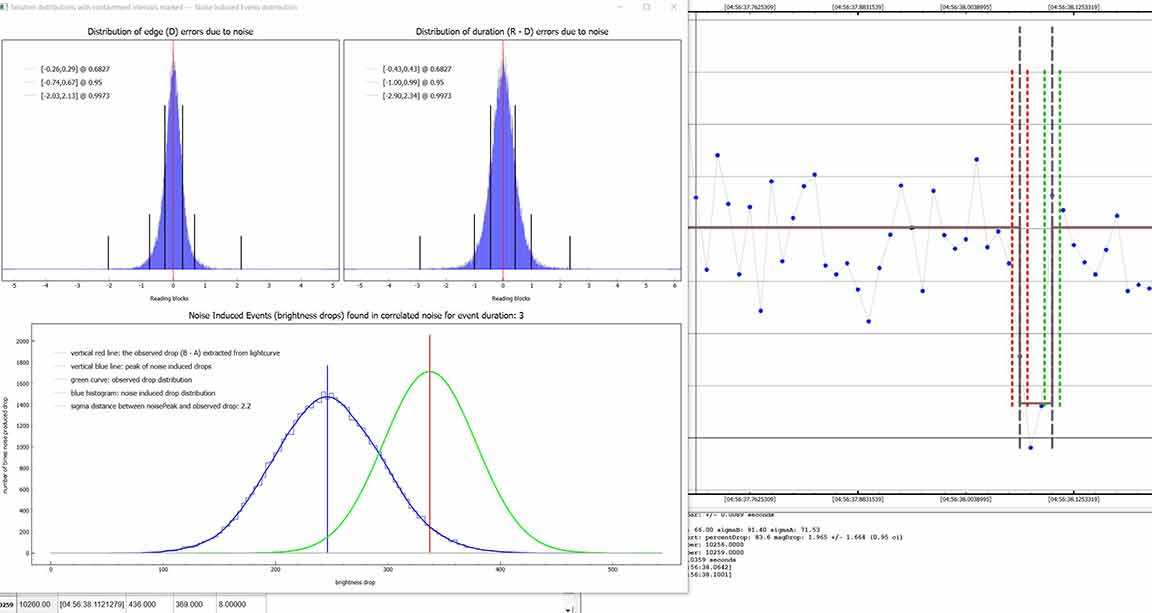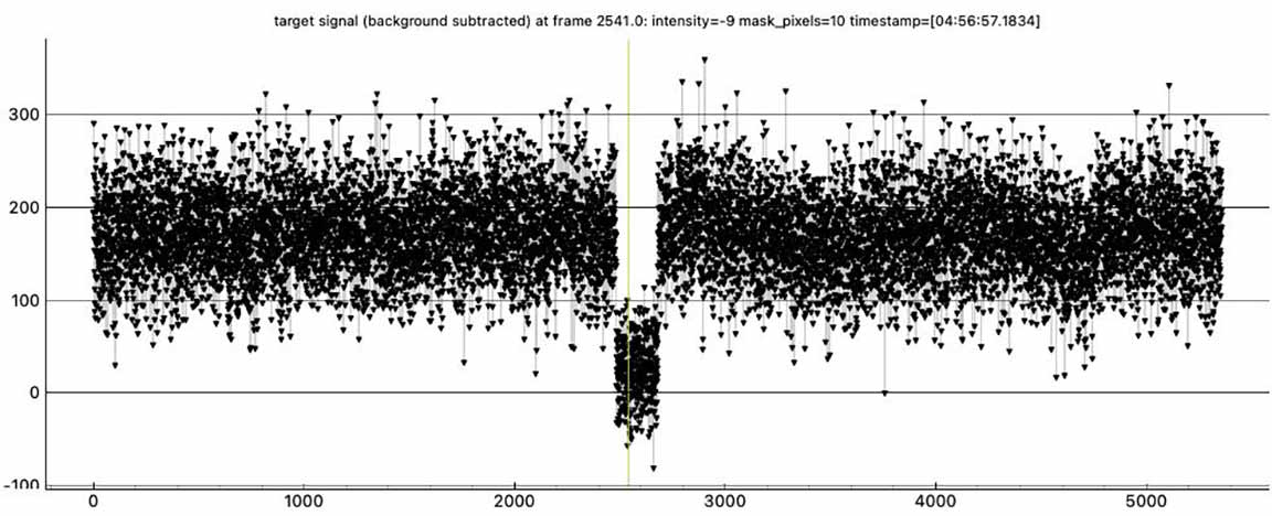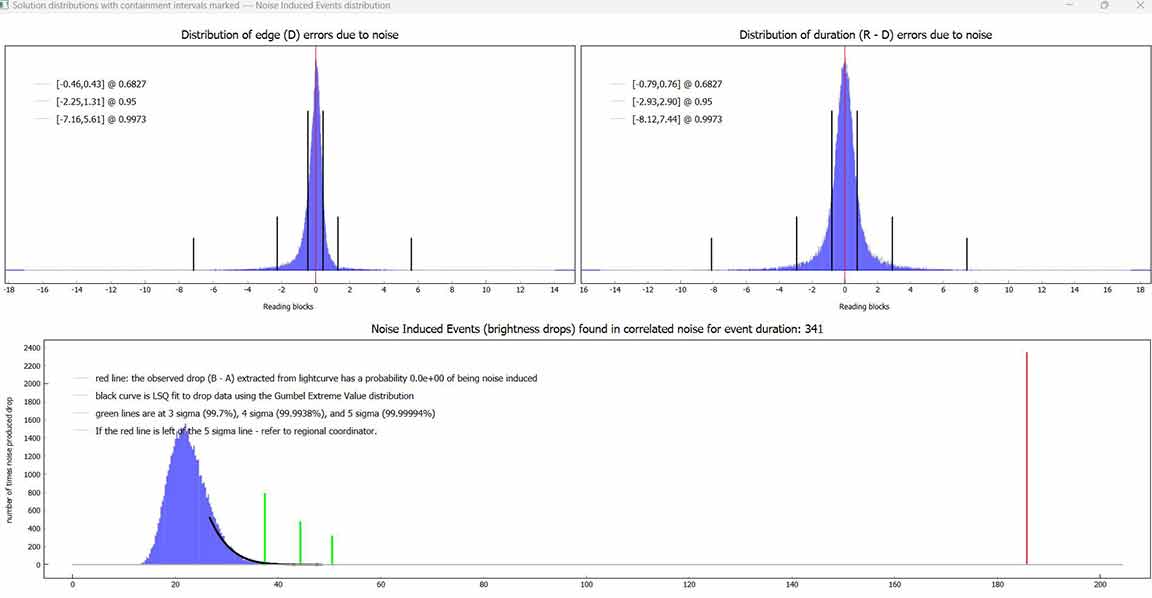 This time using "analyze in field mode", and also catching the "scope bump" quicker and recovering more light curve. The timing accuracies are improved, despite the fact the light curve has more scatter and so DNR is reduced to 2.96 from 4.25. That's expected, since there's 1/4 the light (1/2 due to integration, and 1/2 due to cutting the pixels counted in half) per integration. NIE confidence = 99.1 sigma.