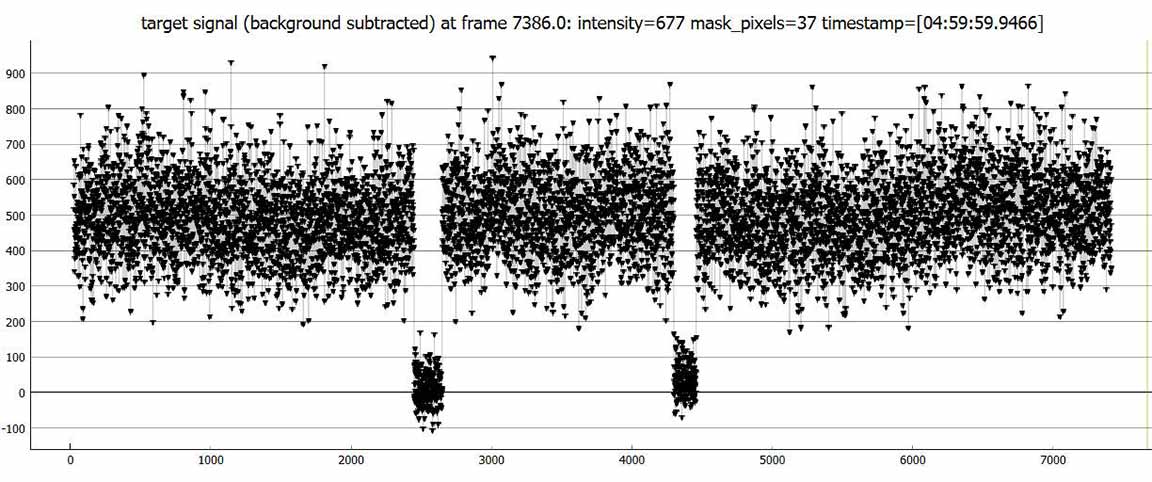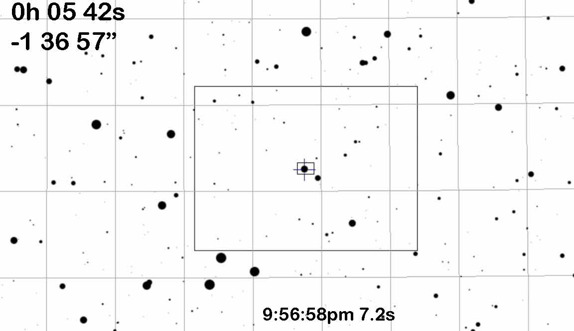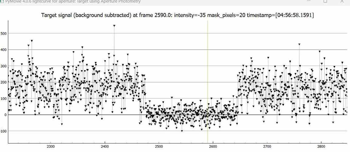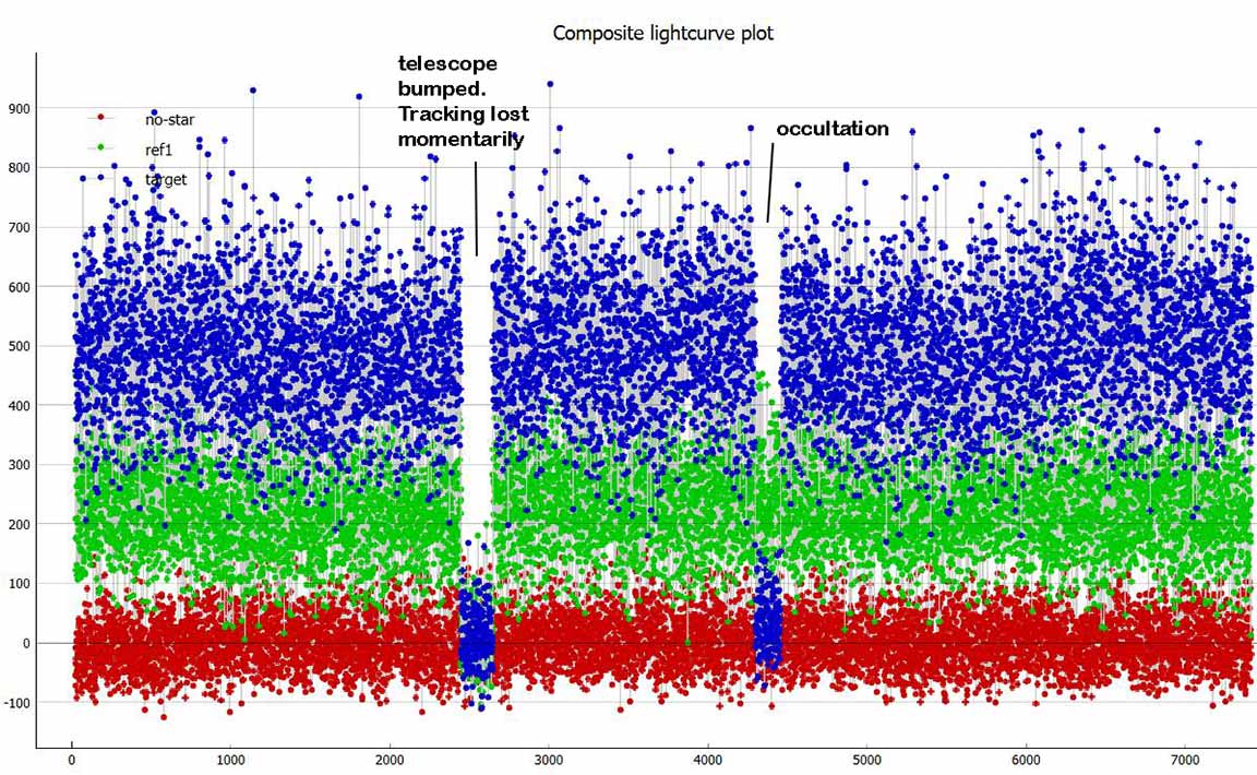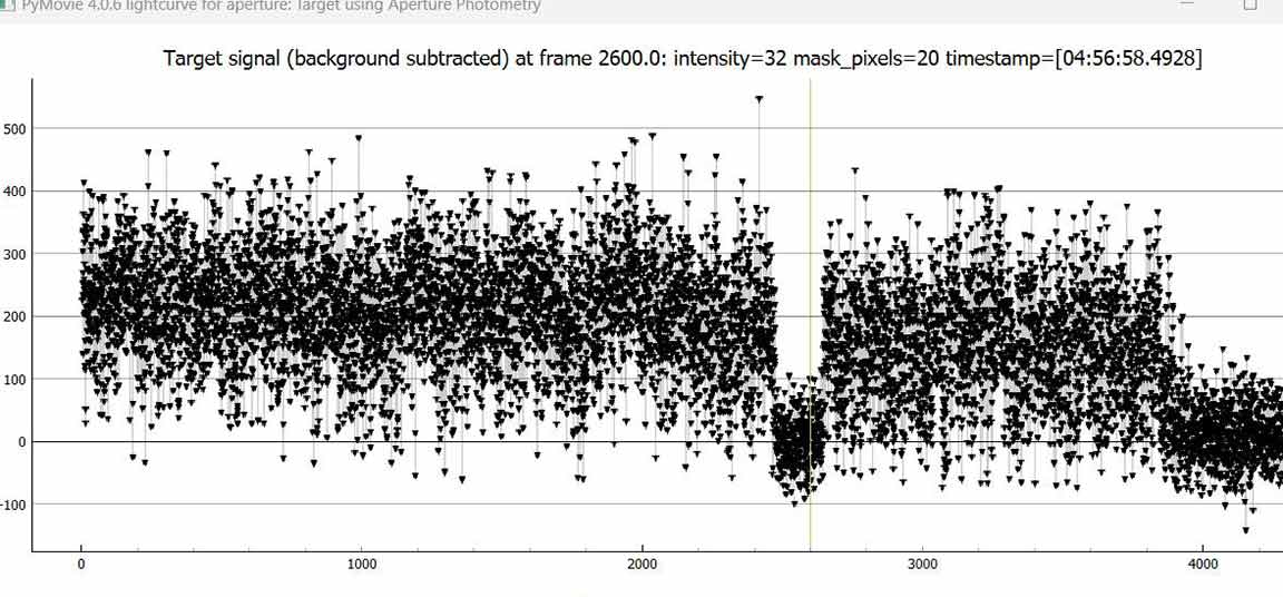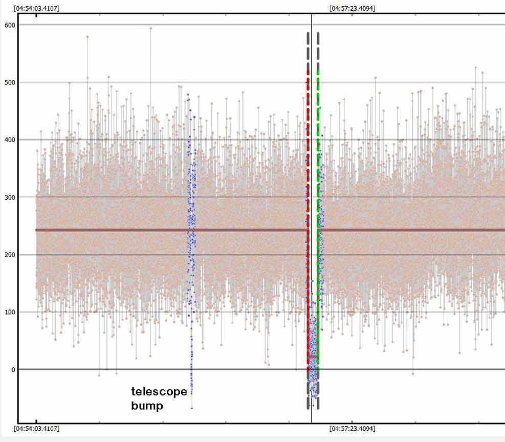 I planned to make an extgra credit session for my students with this event outside the STEM Building room 806 classroom. But fog rolled in early and it was hopeless. So at the 9pm closing of the class, I drove as fast as I could back to Santa Cruz and up High Street and Empire Grade, arriving at Twin Gates where I saw no other occulters occupying it, and so I took advantage. I was able to set up quickly and got on target without trouble. Just barely above the fog, which had risen to Cave Gulch. I got a ~7s occultation at 1x.
