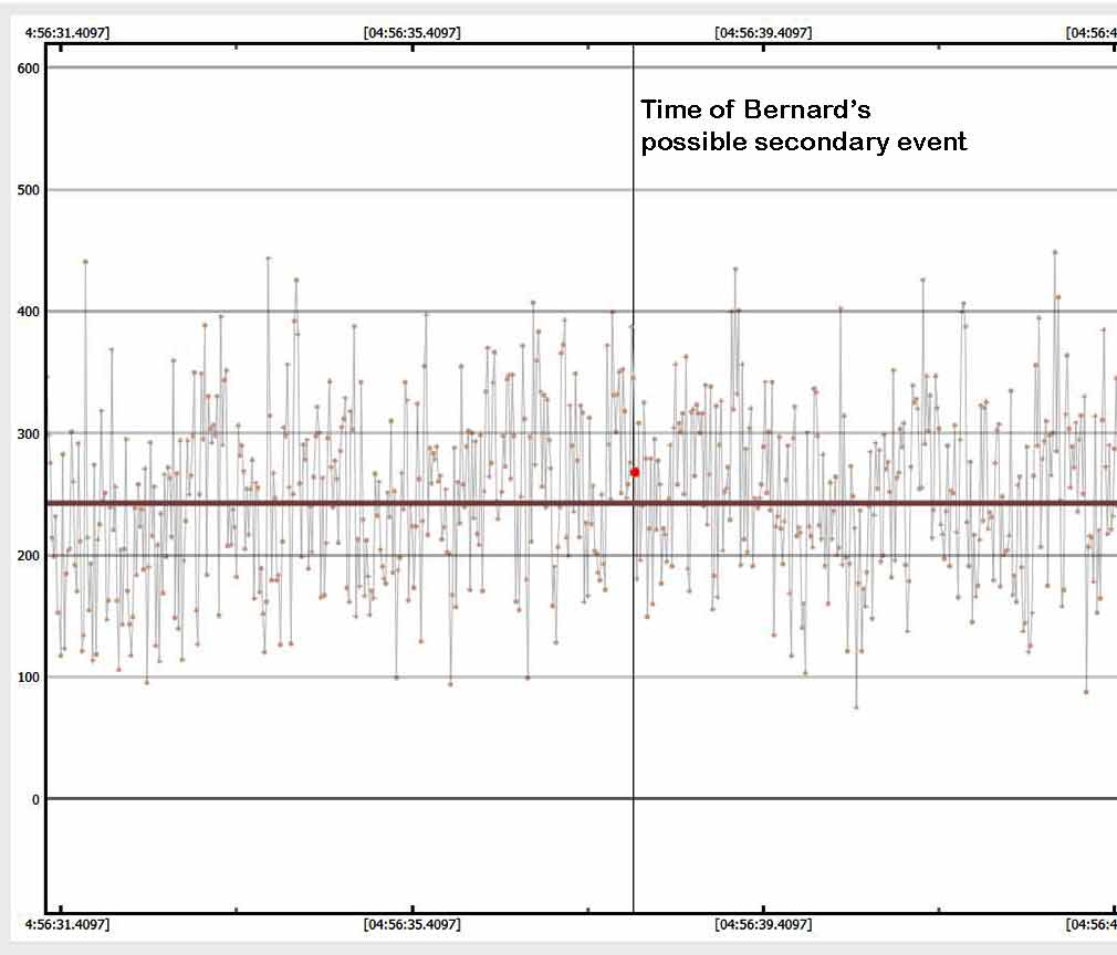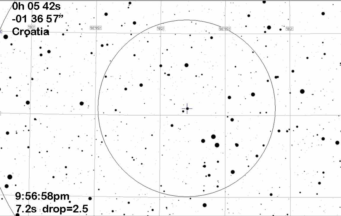 I was 2.2 km cross track south of Bernard's chord. The path width on the map is 120km, the listed diameter of Croatia is 88 km. 88km projecting onto the Earth at 120 km is reasonable. Now, .036 sec / 7s = .005 of the 120km cross track diameter = 0.6 km. So, assuming the likely diameter of the moonlet was not much more than the 0.036 sec inferred diameter, that would put the cross track shadow about 0.7 km wide. I was closest to Bernard's track, but I was 2.20 km south of Bernard's track , or 3x the inferred likely diameter of his moonlet. This says that none of our tracks provide a meaningful constraint or confirmation of his possible moonlet.
