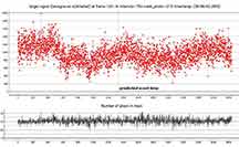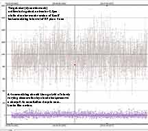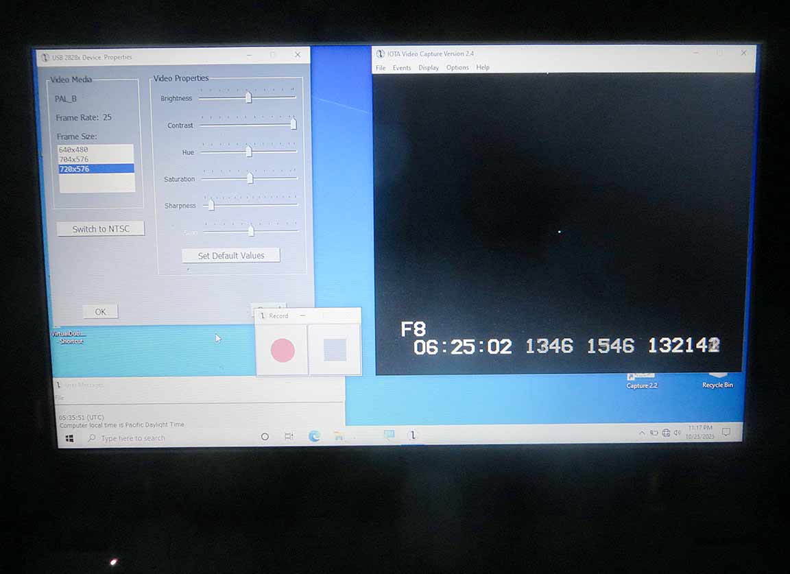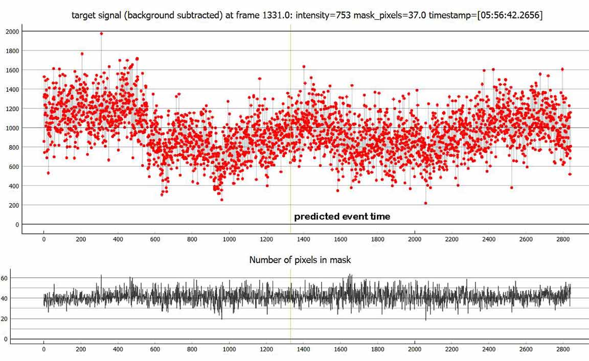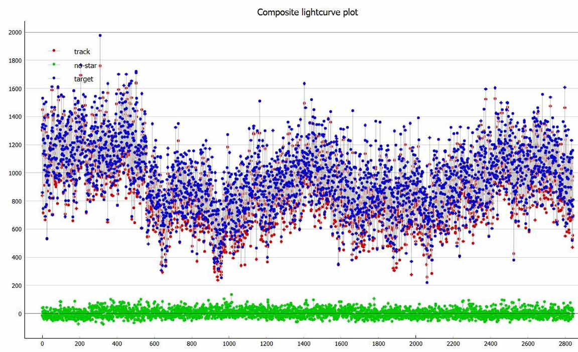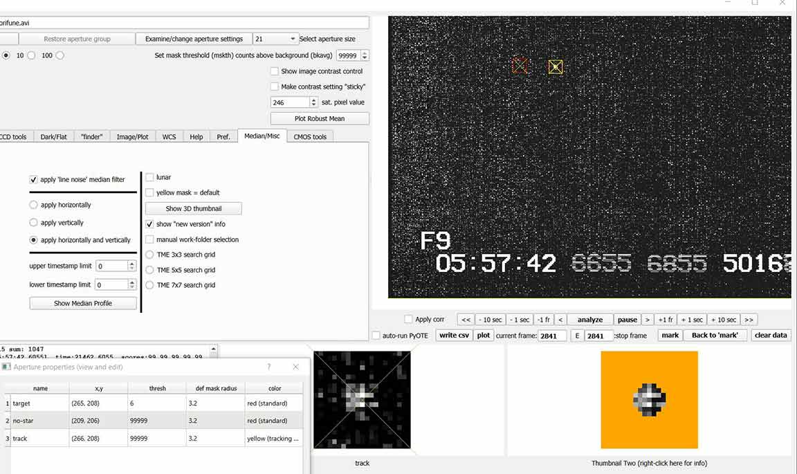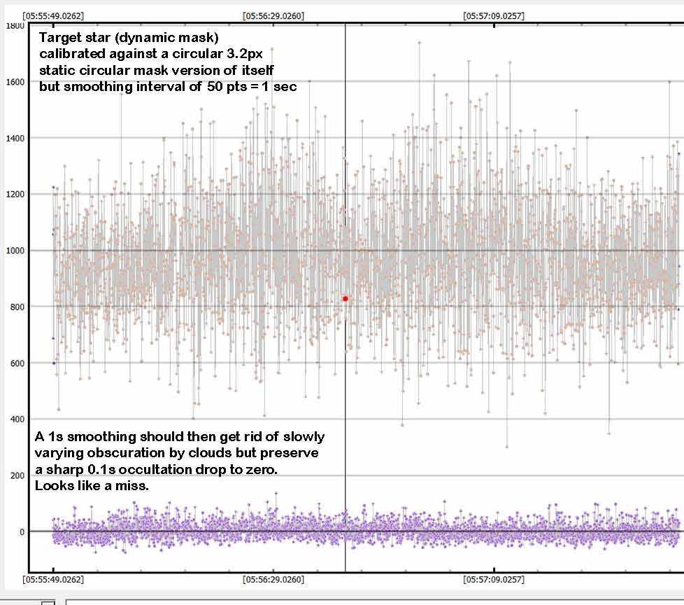I, however, did have variable obscuration, and there were no other stars visible at 1x. I played with gain and settled back at maximum gain=41 since I worried about cloud cover from further south coming in. In order to keep high time cadence and also perhaps see the fain surrounding stars, I adjusted recording contrast to maximum, and could just see the fainter stars. I tried the brightest which was below the target as a tracking star, but 30s before the event the variable light cloud dropped it out of view. I had to re-run through PyMovie and this time only had the tracking star as the target star itself. Despite the variable obscuration, the target was easily visible by eye on the computer screen at all times, and I saw no occultation. The raw light curve below shows no occultation. I set the tracking aperture on the target star but this time as a static 3.2px circular aperture. The target was a dynamic mask aperture.