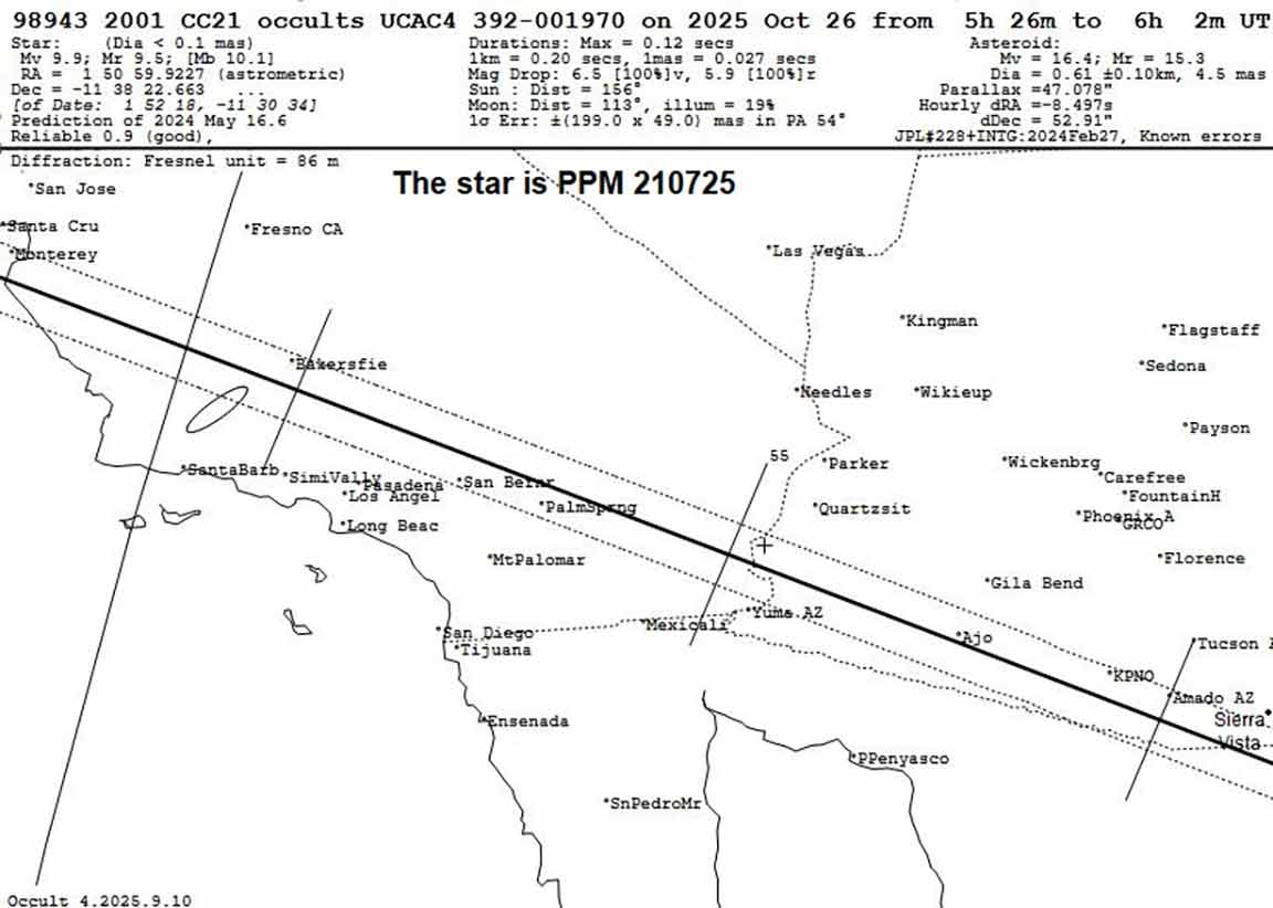 OCT. 26, around 5:55 UT (Sat. Oct. 25, 10:55pm MST/PDT): A 0.1s occultation of a 9.9s star by (98943) Torifune, a 600m near-Earth asteroid and target of Japan's JAXA Hyabusa2 extended mission. An occultation by Torifune was recorded from one (of 21) stations during a 2023 campaign in Japan, but the star unluckily had poor Gaia data (high RUWE, more than for the Pathenope star), seriously degrading its use for updating the orbit. The current orbit JPL#281 now on OWC (link https://cloud.occultwatcher.net/event/1759-98943-26458-647277-U001970# ) should be good (and our star has a good RUWE value), with rather small path errors, like OWC shows; the object is now just 0.2 AU from Earth, so astro -metric observations from around the world are being collected and used by the JPL Horizons team. Still, we'll want several stations since the nominal error is 8 path-widths due to the small size of the object. This is one of the better events to get a good positive for this spacecraft target. The path passes a few miles south of Ajo, AZ, so we are planning a few-station effort for it there. I hope others can join the effort. We'll be coordinating with Richard Nolthenius' team from Santa Cruz, CA. They will be trying it from south of Monterey on the Big Sur coast of Hwy 1.