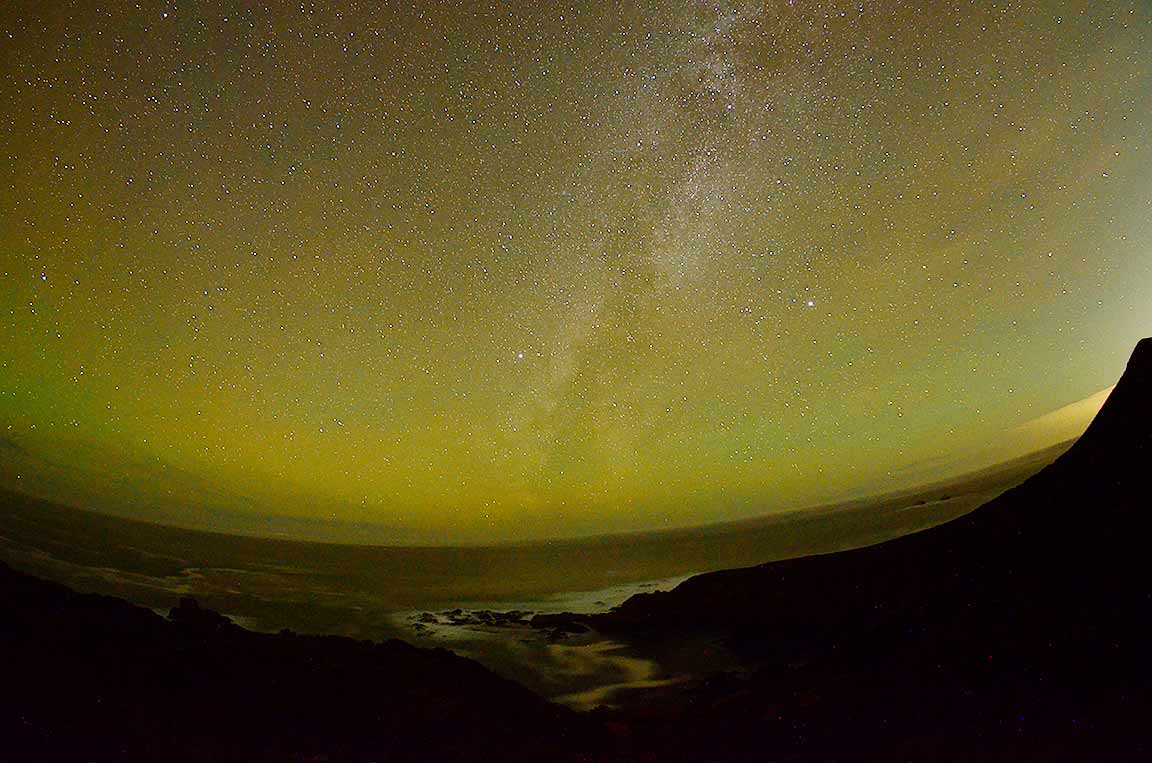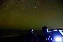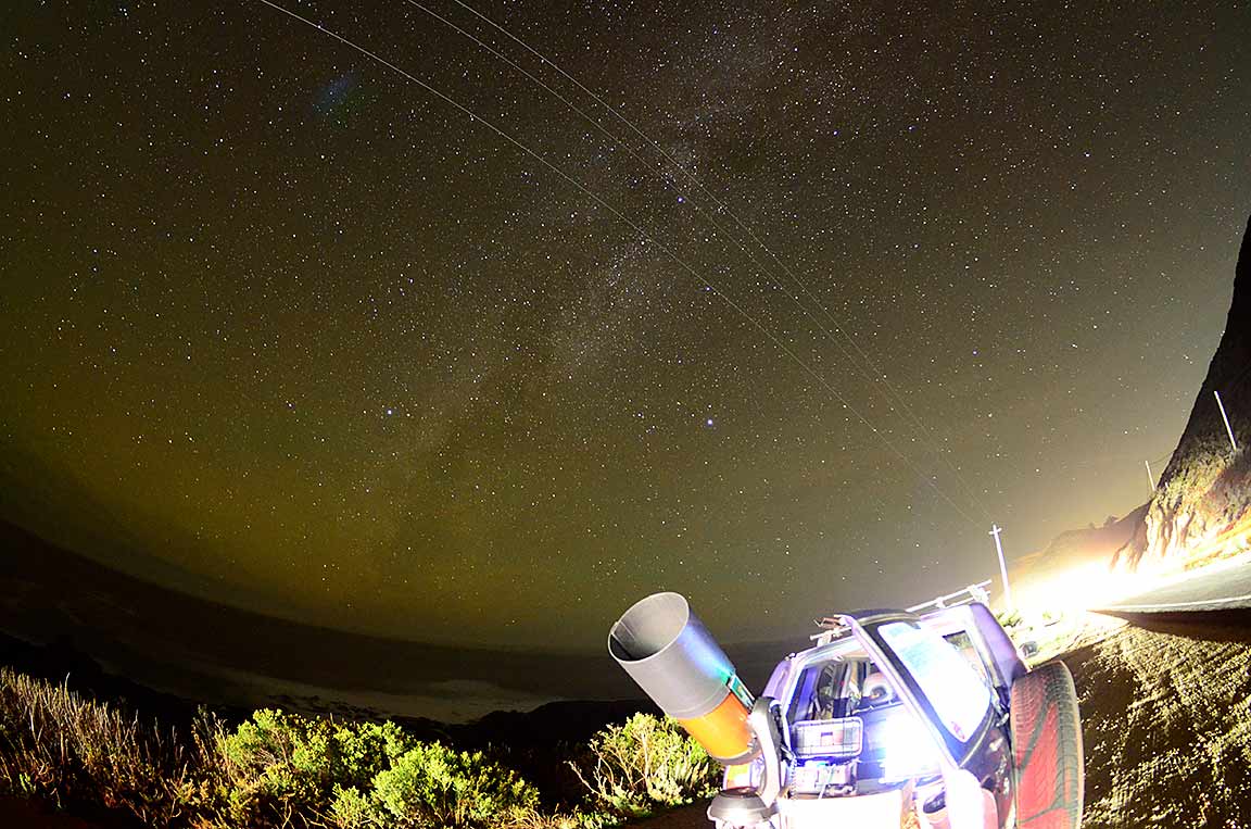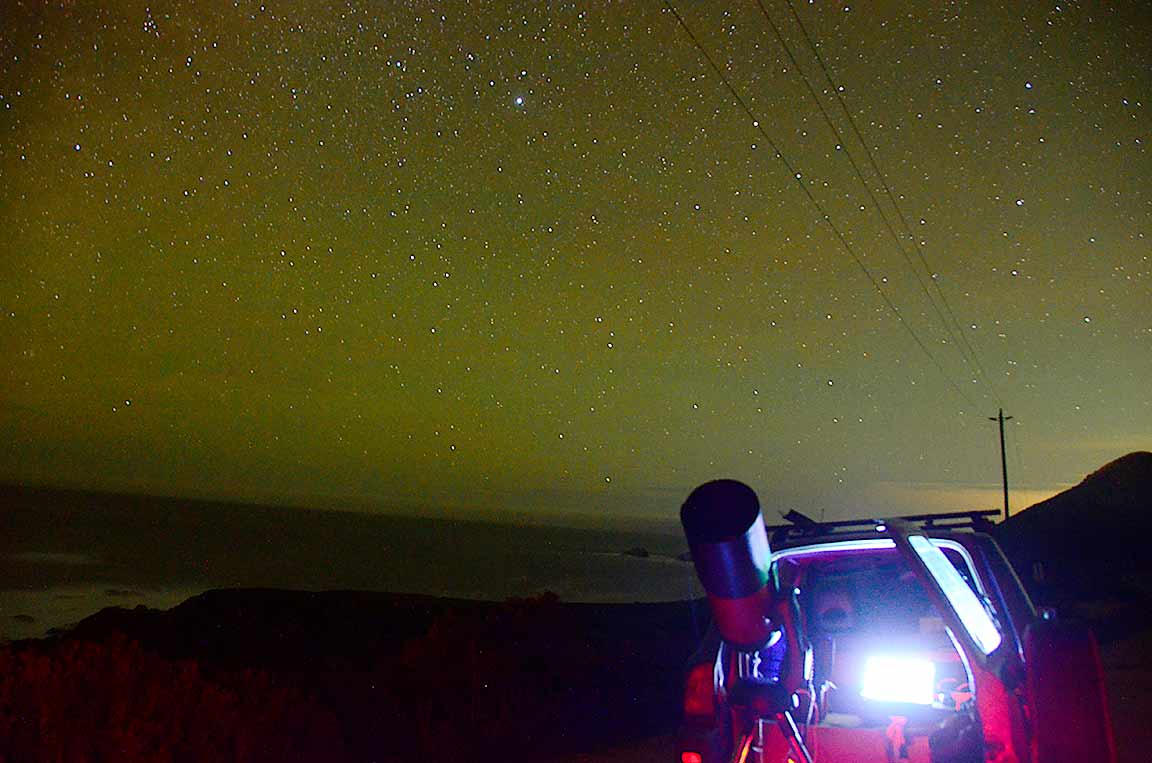 The favorable localized cloud forecast and importance of the event motivated me and Kirk to go for it despite the rain during the day and forecast rain the next day, and the 100% cloud and ground fog cover all around Santa Cruz county. Just before Kirk arrived at my place to carpool down, I realized that the azimuth of the target and the orientation of the steep Big Sur range and road cuts and cypress trees made both of my planned sites very risky or impossible to see the target above local horizon. I search until I found replacements. Kirk at the Garapatta Bluffs Trailhead, and me at another trailhead about a mile further south and halfway between 3N and 4N. Kirk was at 5.5N and would anchor the north end of our distribution. We left Santa Cruz at 8:45pm, and crawled along the freeway Hwy 1 until getting out of the ground fog past Moss Landing for a bit, then back in it in Marina and Monterey. Then, past Carmel and hitting the Big Sur coast, it cleared up, just as the forecast map above suggested. We had near perfectly clear dark moonless skies down to our sites.