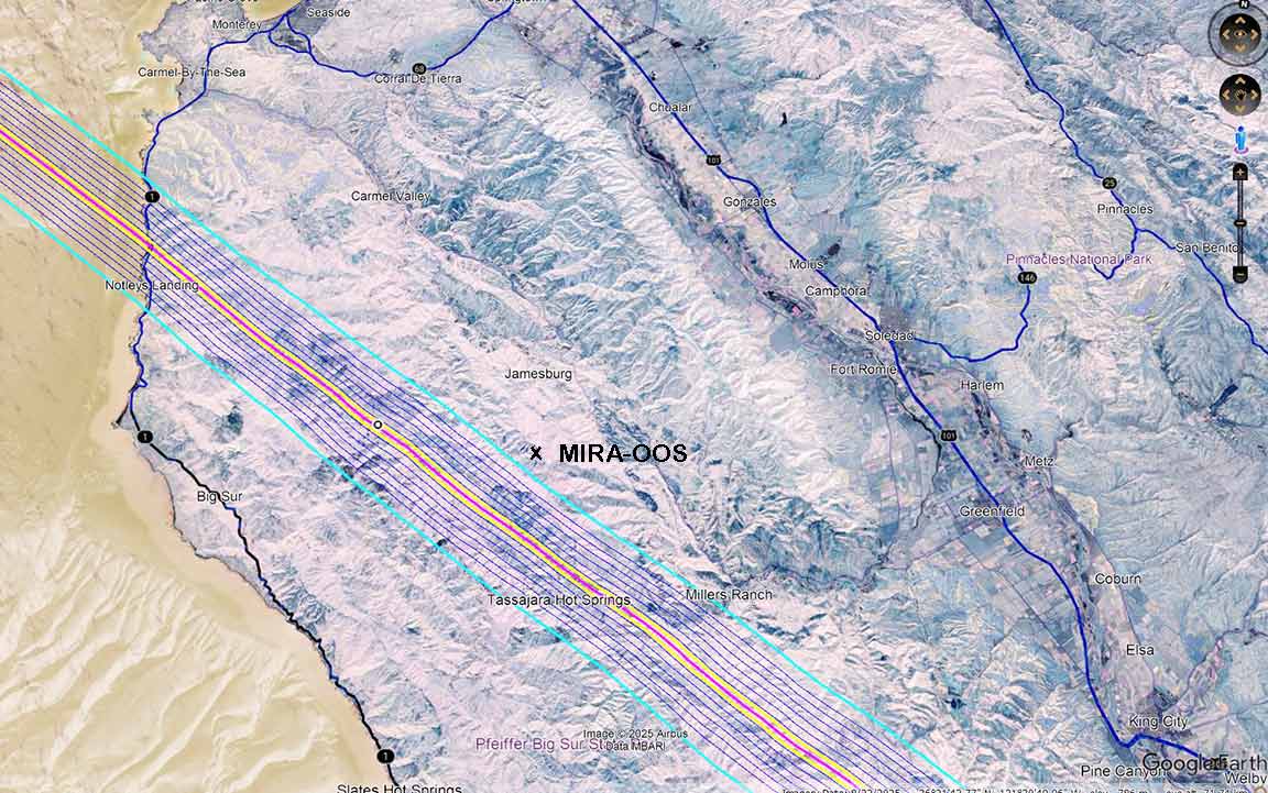 The tracks just miss MIRA-OOS, but it would be a valuable observation just the same. However, the post-storm clouds tend to stick to the mountains and this disfavors Chews Ridge. This will be the last update on the path. |