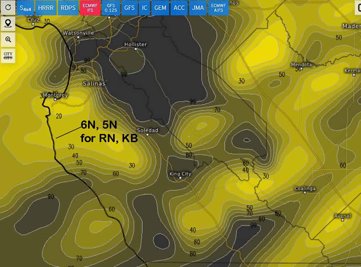 30% cloud cover at Sobranes Trailhead where I am thinking of trying this event. and along the coast north of their to Monterey. The clouds look worse on the lee side of the mountains, in Salinas Valley, and also where the path is much further south and a longer drive. With clearing from the storm happening from north to south, the Salinas Valley looks like a poor bet.