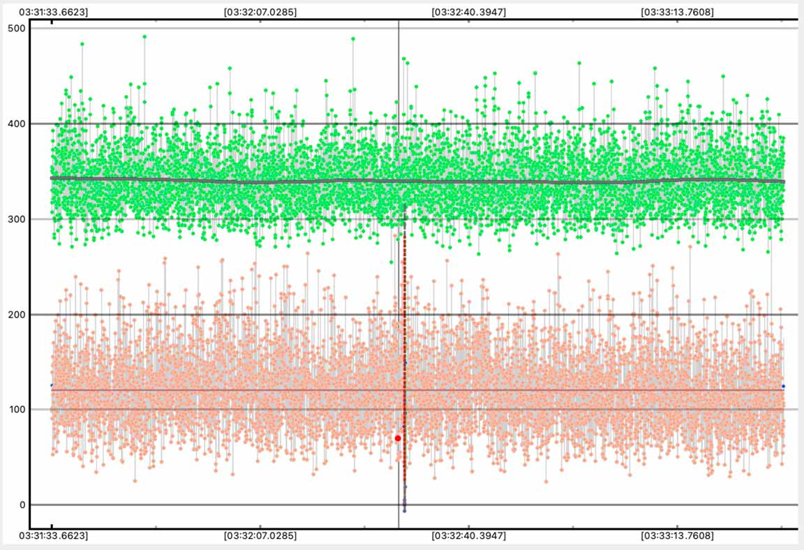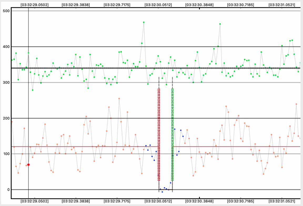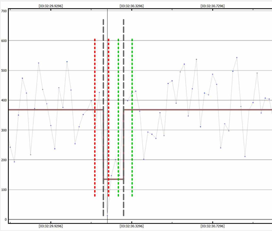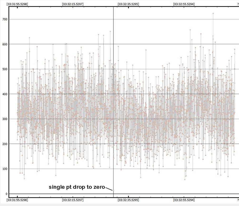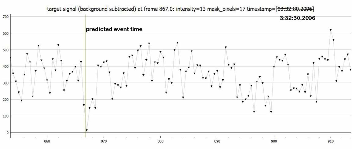 Note that Bernard Huynh recording at 3x finer time resolution, had an identical short drop to zero at this same time, and again at the predicted event time. So despite the less than 3-sigma NIE histogram distribution, the event looks very highly likely to be real and should be combined with Kirk Benders longer and stronger detection near the centerline.