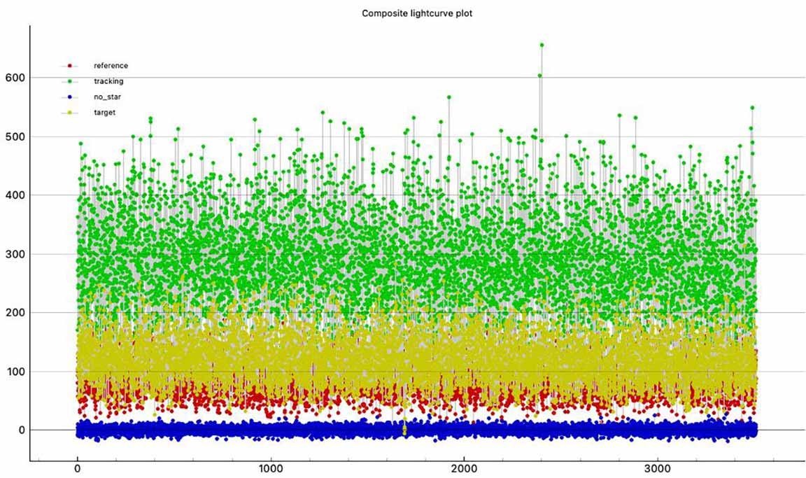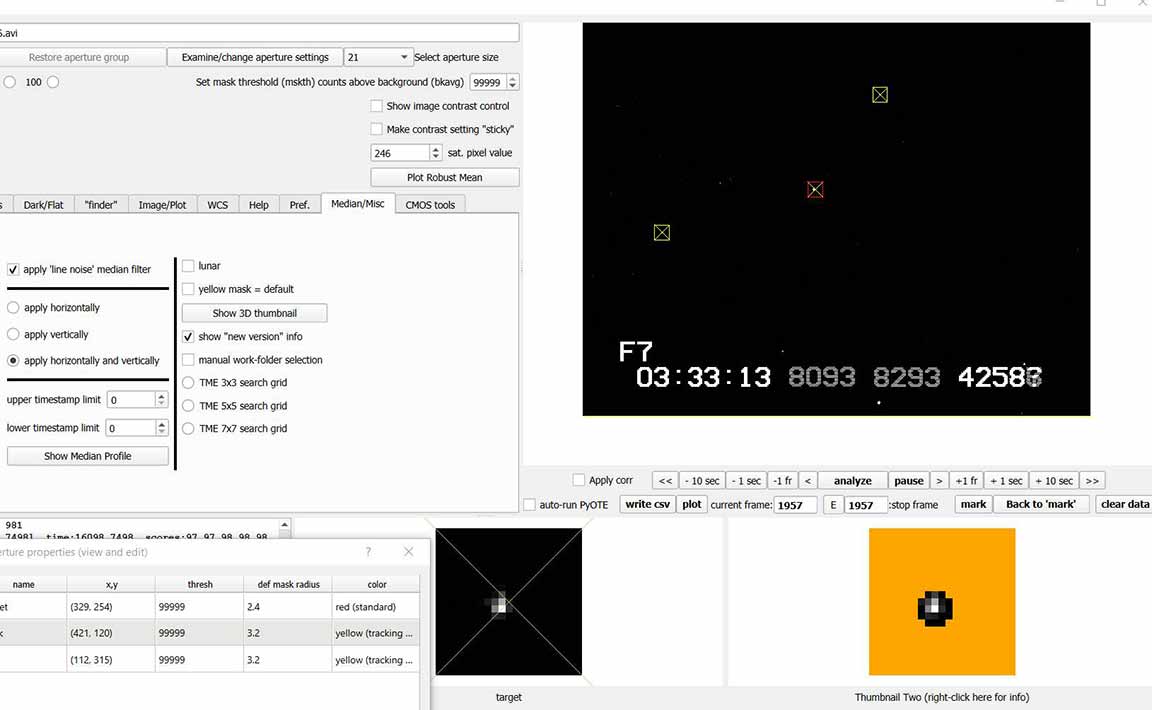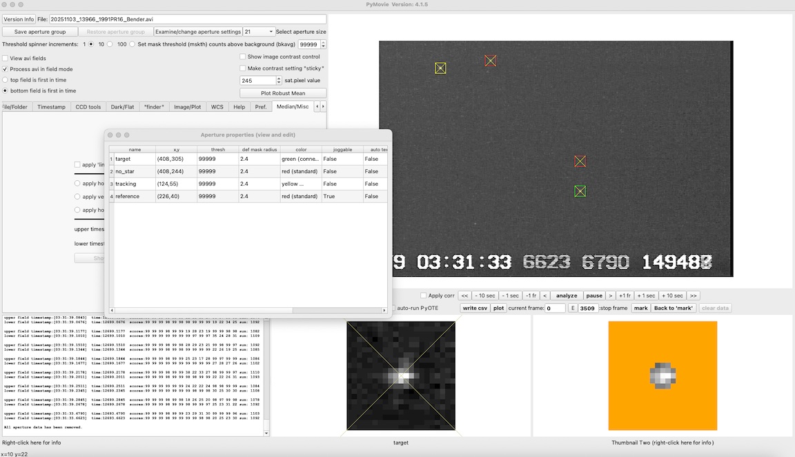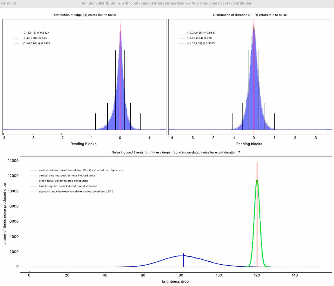 Bayesian probability even more obviously needed in this event, and which is not applied in PyOTE. The priors are:(1) the predicted event duration was only 0.1s, so that raises the a priori probability of a single point drop. (2) This single point drop happened exactly at the predicted event time. The two neighboring points are low but not below the bottom of the scatter of un-occulted points, but may indicate the occultation began during those two integrations. (3) Bernard H saw 3 consecutive ~zeros at the same moment, from 15 ft away. (4) Kirk Bender had a solid 27 sigma positive of the max duration from the centerline, indicating the prediction was on-target, and further suggesting my/Bernard's chord should have had a positive at the predicted time. We did; it was less than the max duration, appropriate since we were halfway to the path edge.