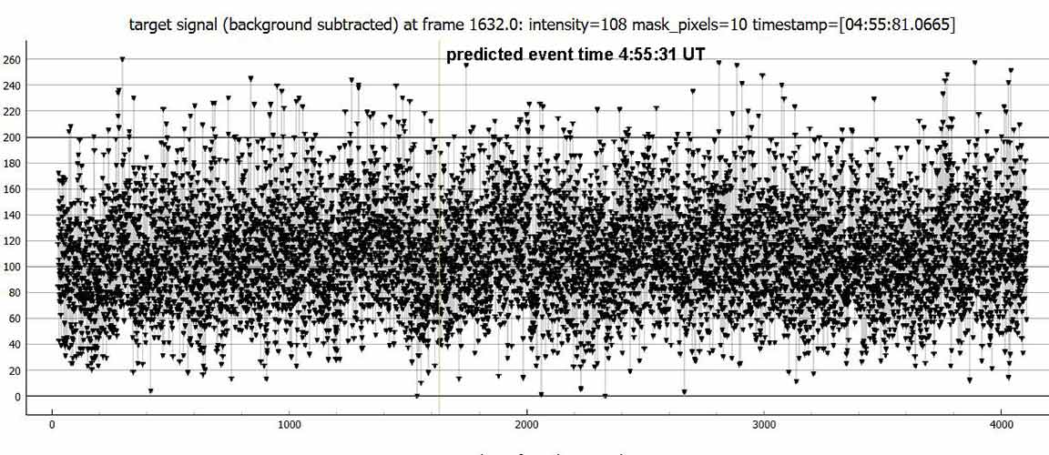 I set up on Glenwood Cutoff, just south of the "Red Realty" place, on a spur dead end overlooking Hwy 17. I got a recording at 1x. I didn't notice cloud trouble during the event. It looked like a miss while watching live. It looks like Kirk ended up being just inside the southern limit, with a duration only 1/4 of the predicted maximum. I was just a little too far south. No hint of an occultation for me at Kirk's mid-time of event. A miss. Karl also had a miss, from home.