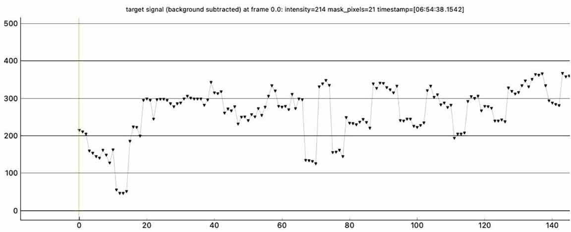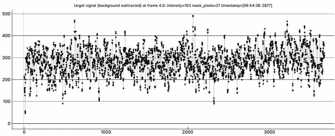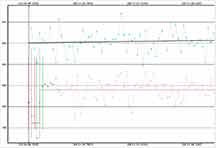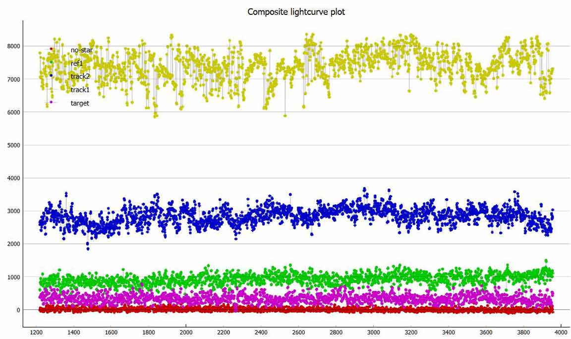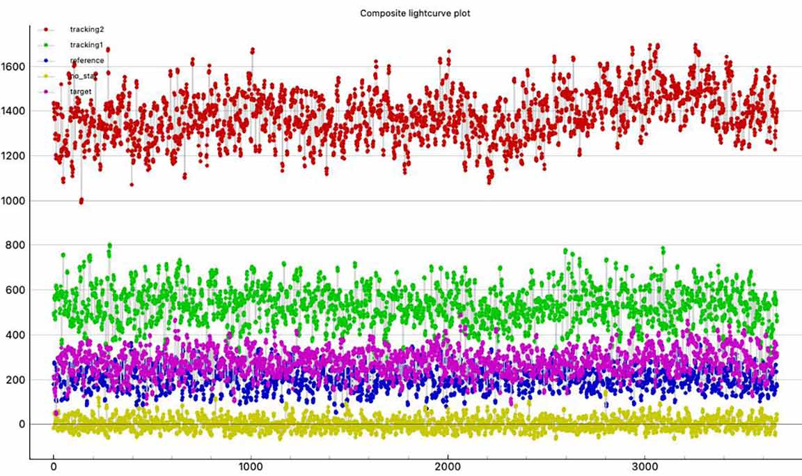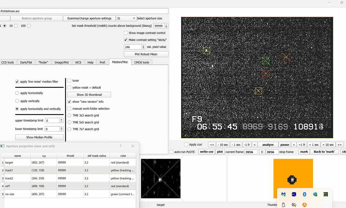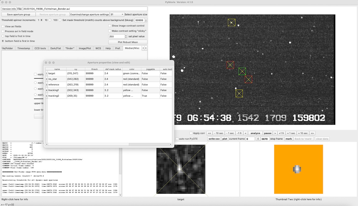 Looks like I got an event for Fichtelman. I tried Fichtelman 16 minutes after 1999 XD, at the same spot, the berm. The 1999 XD recording was garbled and useless probably due to moisture from the fog on 17 for Mitaka that night. For Fichtelman the recording is not garbled but I mistakenly started recording at the predicted event time instead of a minute earlier. But it looks like I got an event right at the start of the recording, with the first reading at 06:54:38.1542, dropping much lower than the rest of the recording. The sky looked clear but at 4x I thought the target was too noisy so I recorded at 8x. Later I could see with a long exposure camera shot that there were high thin clouds. At 8x, the points are in groups of four in pymovie plots and in the csv file. However, the first group has only 3 points, i.e. I started with an integration underway. If I do a block integration in pyote, it does a block size 4 but it offsets by 3, it truncates the first 3 points and it cuts off the beginning of the drop. If I then try to find an event, it says "No event fitting search criteria could be found." So I added a point, a row in the csv file at the beginning, with the target signal an average of the first 3 points and a timestamp of the first time minus the delta of the first and the second. Then if I do a block integration it gets 4 points at the beginning and doesn't truncate the top of the drop. It then finds a 0.4004 sec event with a NIE sigma of 2.0, near predicted duration and predicted time. See what you think, and if I'm justified adding a point at the beginning so it block integrates properly.