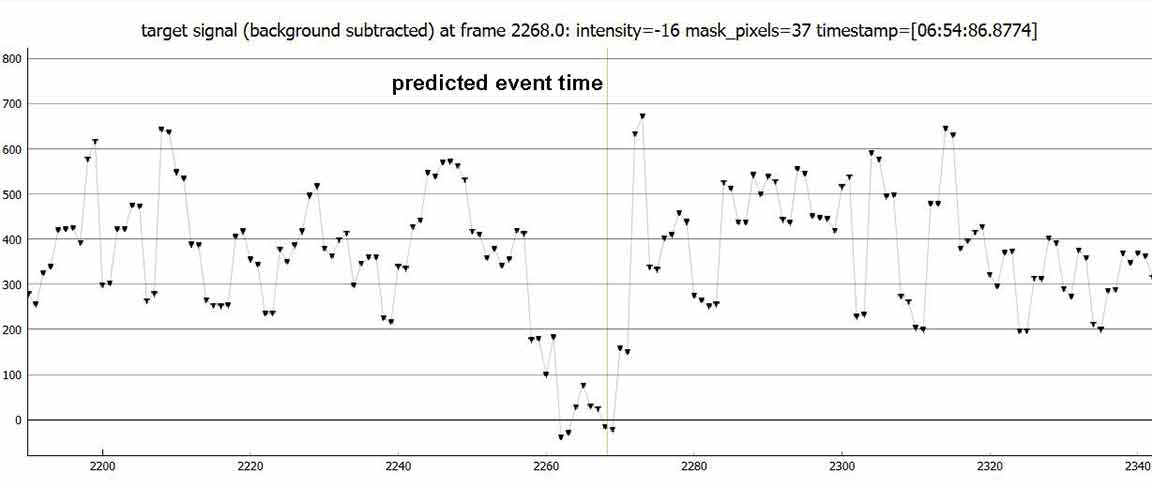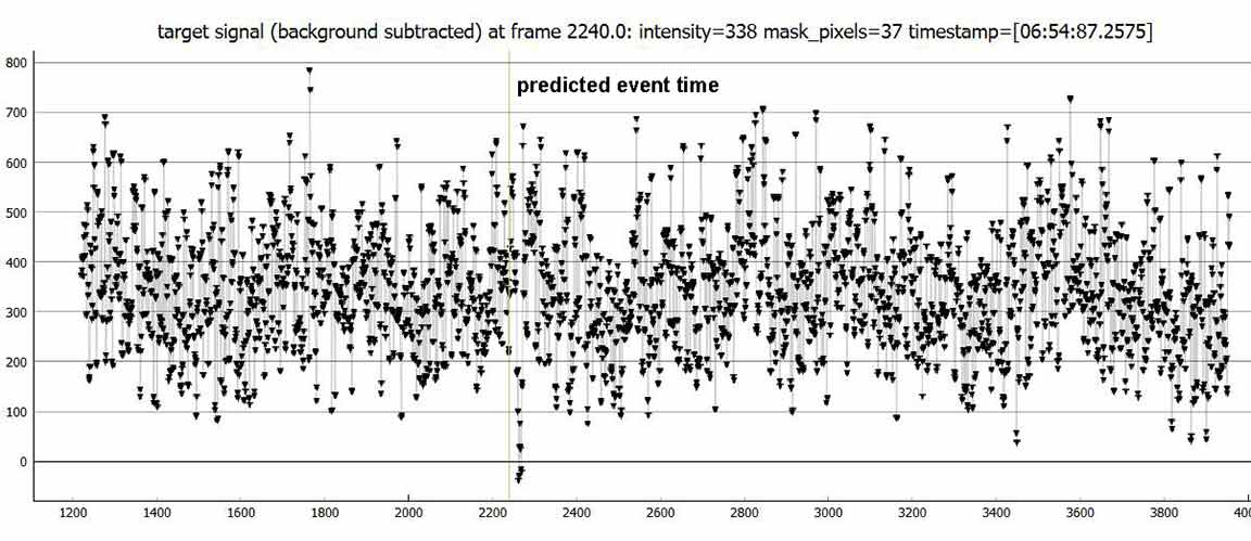 I observed from the cul-de-sac of Pineridge Rd in Bonny Doon, at 4x. This event done during my pre-discovery days of how to optimize the recording level and contrast controls. Instead I'm using too much brightness level and too high a contrast, adding too much sky and background noise to the data. Still, the occultation is obvious.
