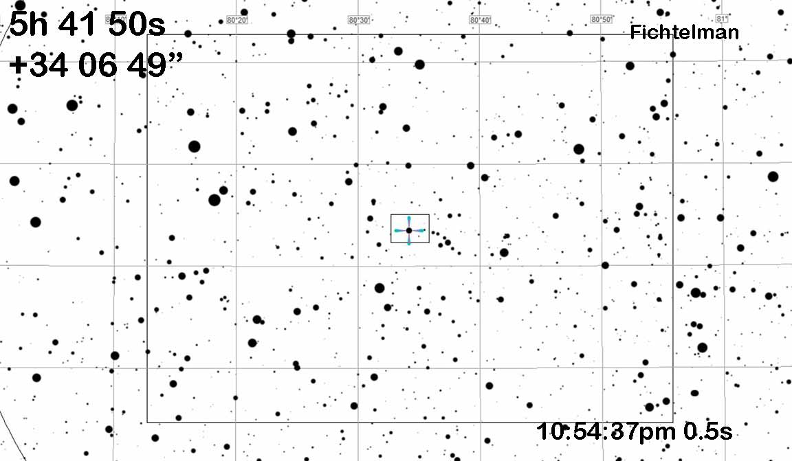 This event is just 14 minutes after 1999XD80, try from same site. High in sky in Auriga. Because of the short break, I'm assuming you'll be swinging straight over with the Watec still attached and so no eyepiece view is necessary. I've instead provided a wider view of the Watec chip field.